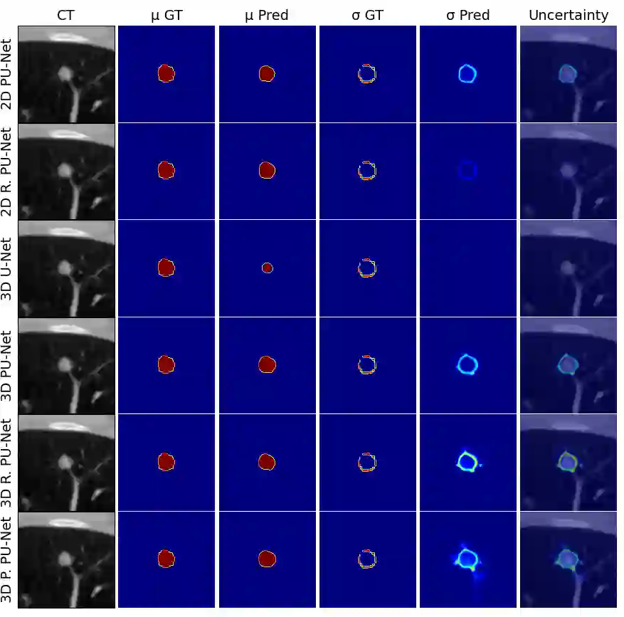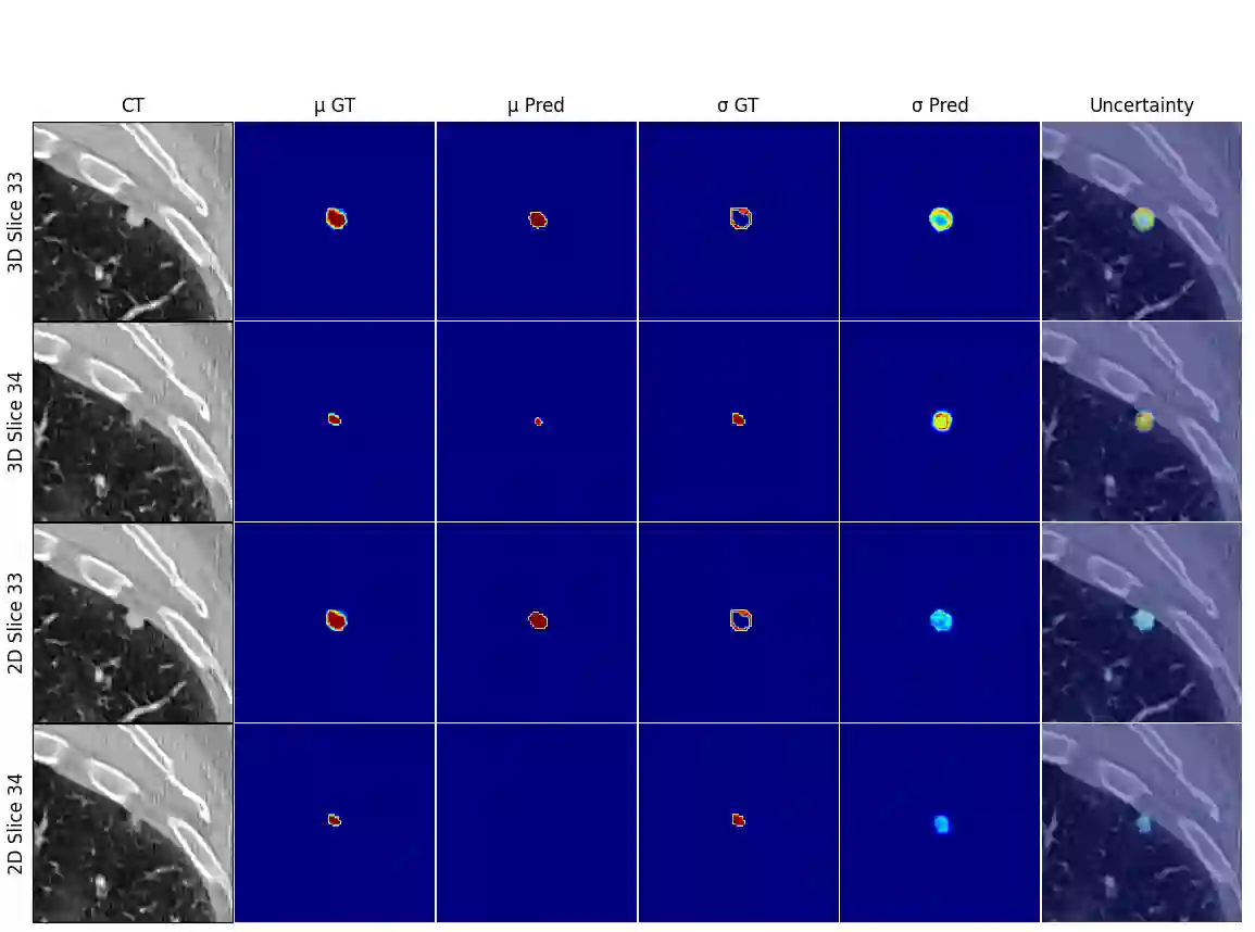 Uncertainty quantification in medical images has become an essential addition to segmentation models for practical application in the real world. Although there are valuable developments in accurate uncertainty quantification methods using 2D images and slices of 3D volumes, in clinical practice, the complete 3D volumes (such as CT and MRI scans) are used to evaluate and plan the medical procedure. As a result, the existing 2D methods miss the rich 3D spatial information when resolving the uncertainty. A popular approach for quantifying the ambiguity in the data is to learn a distribution over the possible hypotheses. In recent work, this ambiguity has been modeled to be strictly Gaussian. Normalizing Flows (NFs) are capable of modelling more complex distributions and thus, better fit the embedding space of the data. To this end, we have developed a 3D probabilistic segmentation framework augmented with NFs, to enable capturing the distributions of various complexity. To test the proposed approach, we evaluate the model on the LIDC-IDRI dataset for lung nodule segmentation and quantify the aleatoric uncertainty introduced by the multi-annotator setting and inherent ambiguity in the CT data. Following this approach, we are the first to present a 3D Squared Generalized Energy Distance (GED) of 0.401 and a high 0.468 Hungarian-matched 3D IoU. The obtained results reveal the value in capturing the 3D uncertainty, using a flexible posterior distribution augmented with a Normalizing Flow. Finally, we present the aleatoric uncertainty in a visual manner with the aim to provide clinicians with additional insight into data ambiguity and facilitating more informed decision-making.