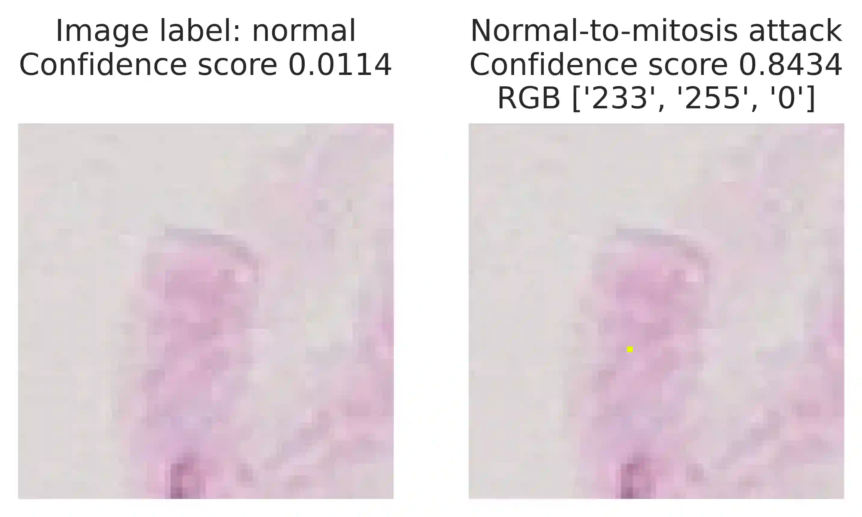 In this article we demonstrate that a state-of-the-art machine learning model predicting whether a whole slide image contains mitosis can be fooled by changing just a single pixel in the input image. Computer vision and machine learning can be used to automate various tasks in cancer diagnostic and detection. If an attacker can manipulate the automated processing, the results can be devastating and in the worst case lead to wrong diagnostic and treatments. In this research one-pixel attack is demonstrated in a real-life scenario with a real tumor dataset. The results indicate that a minor one-pixel modification of a whole slide image under analysis can affect the diagnosis. The attack poses a threat from the cyber security perspective: the one-pixel method can be used as an attack vector by a motivated attacker.