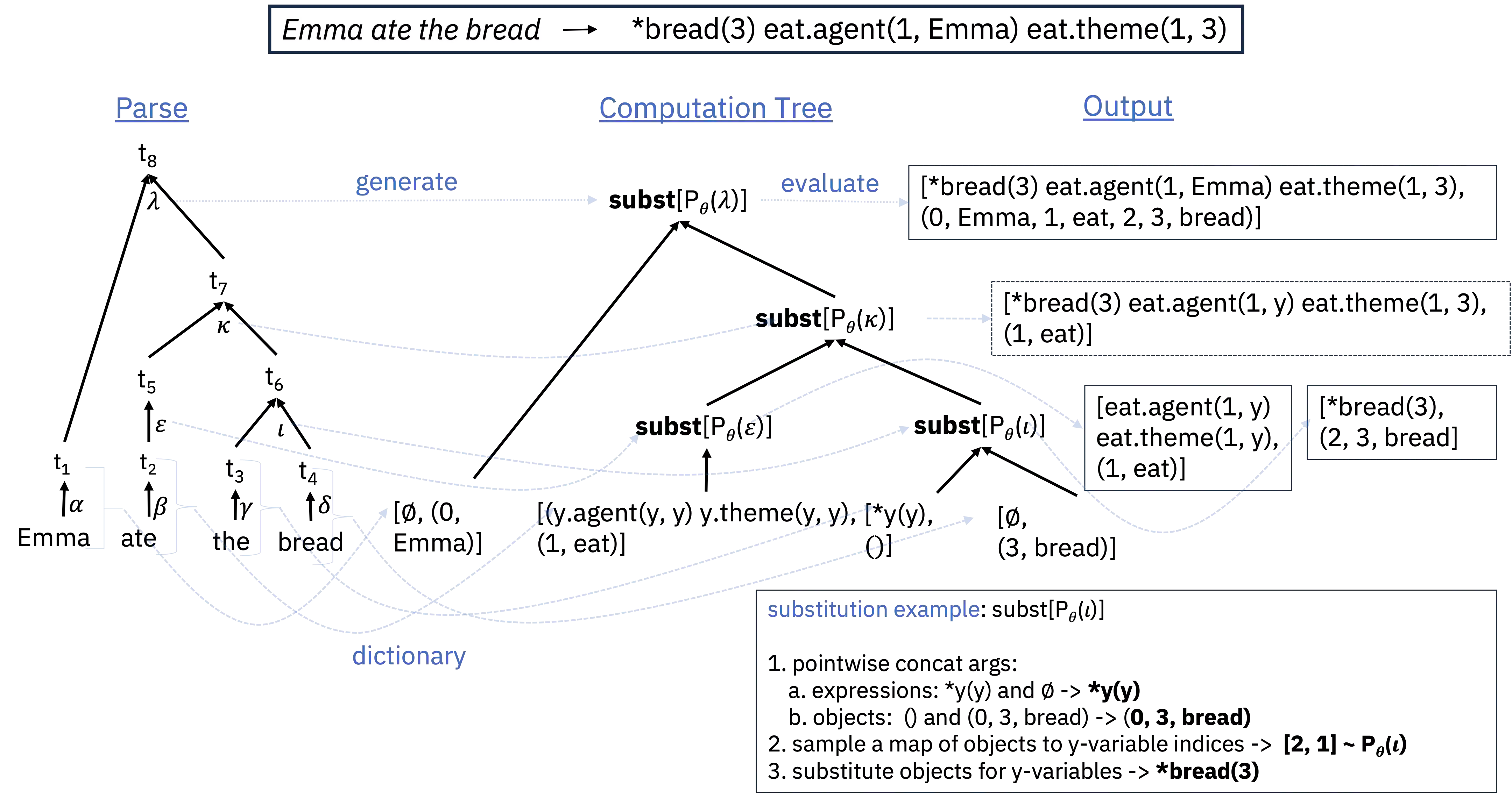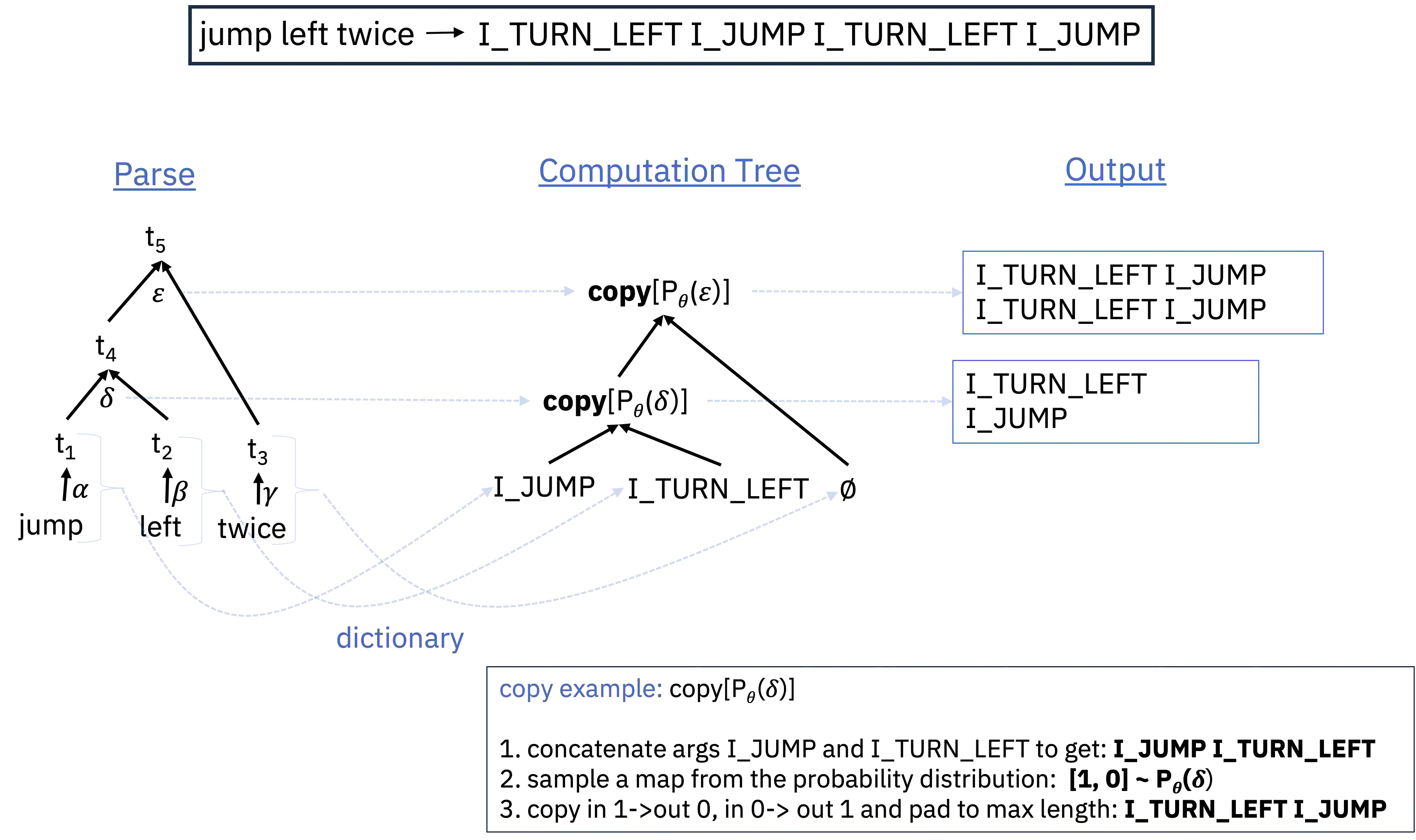 Compositional generalization is a key ability of humans that enables us to learn new concepts from only a handful examples. Neural machine learning models, including the now ubiquitous Transformers, struggle to generalize in this way, and typically require thousands of examples of a concept during training in order to generalize meaningfully. This difference in ability between humans and artificial neural architectures, motivates this study on a neuro-symbolic architecture called the Compositional Program Generator (CPG). CPG has three key features: \textit{modularity}, \textit{composition}, and \textit{abstraction}, in the form of grammar rules, that enable it to generalize both systematically to new concepts in a few-shot manner, as well as productively by length on various sequence-to-sequence language tasks. For each input, CPG uses a grammar of the input language and a parser to generate a parse in which each grammar rule is assigned its own unique semantic module, a probabilistic copy or substitution program. Instances with the same parse are always processed with the same composed modules, while those with different parses may be processed with different modules. CPG learns parameters for the modules and is able to learn the semantics for new rules and types incrementally, without forgetting or retraining on rules it's already seen. It achieves perfect generalization on both the SCAN and COGS benchmarks using just 14 examples for SCAN and 22 examples for COGS -- state-of-the-art accuracy with a 1000x improvement in sample efficiency.