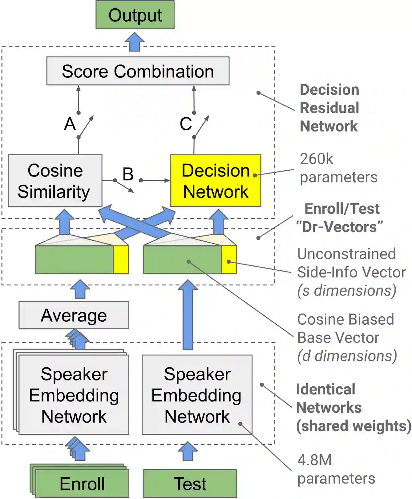 翻译:在这项工作中,我们提议以能够捕捉不确定性、注册/测试不对称和额外非线性信息的方式评分这些表达方式。这是通过将第二阶段神经网络(称为决策网络)作为端到端培训制度的一部分而实现的。我们特别提出了决定剩余网络的概念,它涉及利用一个紧凑的决定网络来利用连线评分或第二顺序评分,并模拟所需的剩余信号。此外,我们提出了对一般端到端软负损失功能的修改,以更好地针对同一/不同发言者分数的分离。我们观察到两种技术的显著性能收益。