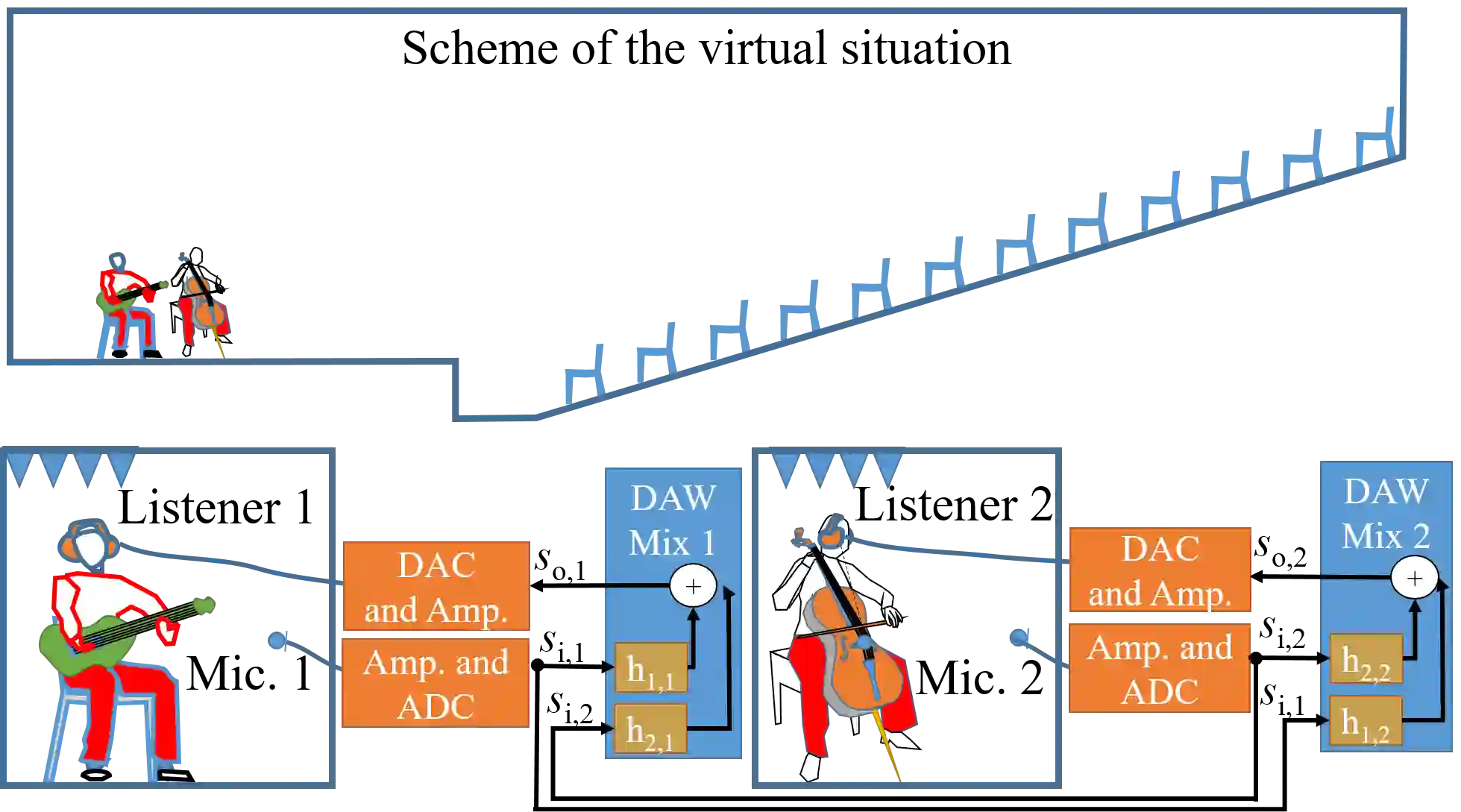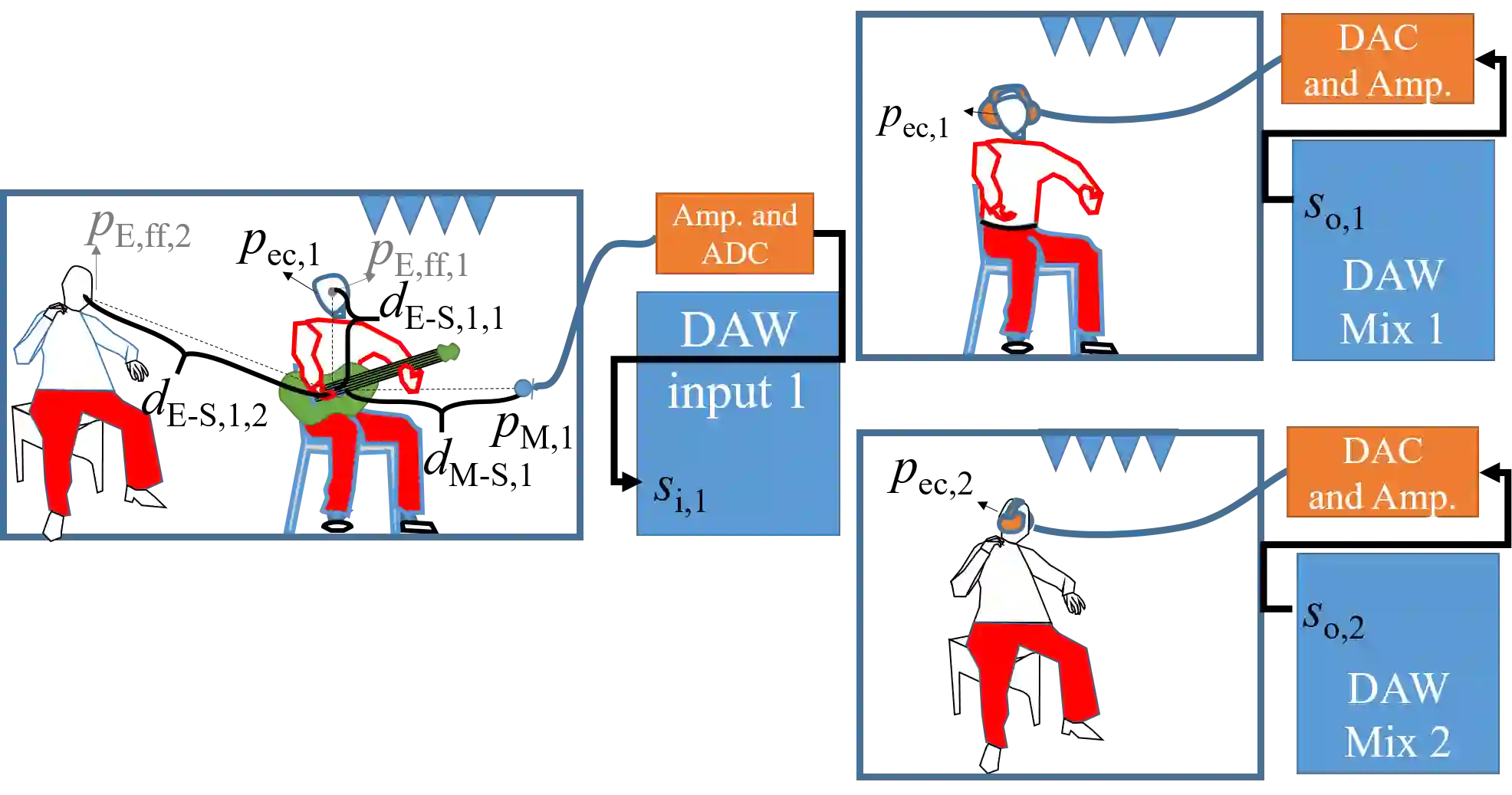This article presents an interactive system for stage acoustics experimentation including considerations for hearing one's own and others' instruments. The quality of real-time auralization systems for psychophysical experiments on music performance depends on the system's calibration and latency, among other factors (e.g. visuals, simulation methods, haptics, etc). The presented system focuses on the acoustic considerations for laboratory implementations. The calibration is implemented as a set of filters accounting for the microphone-instrument distances and the directivity factors, as well as the transducers' frequency responses. Moreover, sources of errors are characterized using both state-of-the-art information and derivations from the mathematical definition of the calibration filter. In order to compensate for hardware latency without cropping parts of the simulated impulse responses, the virtual direct sound of musicians hearing themselves is skipped from the simulation and addressed by letting the actual direct sound reach the listener through open headphones. The required latency compensation of the interactive part (i.e. hearing others) meets the minimum distance requirement between musicians, which is 2 m for the implemented system. Finally, a proof of concept is provided that includes objective and subjective experiments, which give support to the feasibility of the proposed setup.