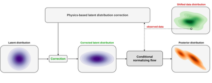 Bayesian inference for high-dimensional inverse problems is computationally costly and requires selecting a suitable prior distribution. Amortized variational inference addresses these challenges via a neural network that approximates the posterior distribution not only for one instance of data, but a distribution of data pertaining to a specific inverse problem. During inference, the neural network -- in our case a conditional normalizing flow -- provides posterior samples at virtually no cost. However, the accuracy of amortized variational inference relies on the availability of high-fidelity training data, which seldom exists in geophysical inverse problems due to the Earth's heterogeneity. In addition, the network is prone to errors if evaluated over out-of-distribution data. As such, we propose to increase the resilience of amortized variational inference in the presence of moderate data distribution shifts. We achieve this via a correction to the latent distribution that improves the posterior distribution approximation for the data at hand. The correction involves relaxing the standard Gaussian assumption on the latent distribution and parameterizing it via a Gaussian distribution with an unknown mean and (diagonal) covariance. These unknowns are then estimated by minimizing the Kullback-Leibler divergence between the corrected and the (physics-based) true posterior distributions. While generic and applicable to other inverse problems, by means of a linearized seismic imaging example, we show that our correction step improves the robustness of amortized variational inference with respect to changes in the number of seismic sources, noise variance, and shifts in the prior distribution. This approach provides a seismic image with limited artifacts and an assessment of its uncertainty at approximately the same cost as five reverse-time migrations.