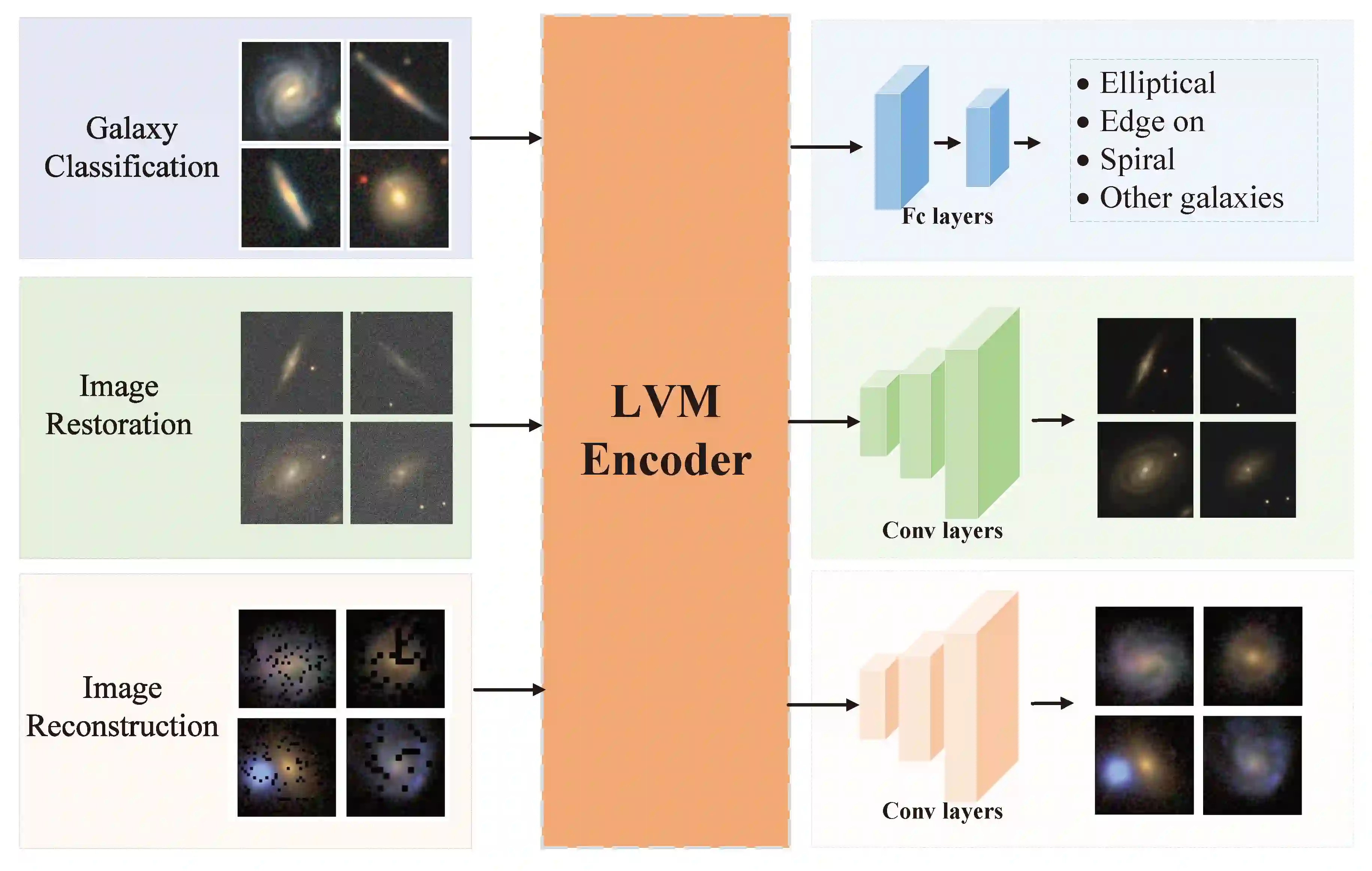 The exponential growth of astronomical datasets provides an unprecedented opportunity for humans to gain insight into the Universe. However, effectively analyzing this vast amount of data poses a significant challenge. Astronomers are turning to deep learning techniques to address this, but the methods are limited by their specific training sets, leading to considerable duplicate workloads too. Hence, as an example to present how to overcome the issue, we built a framework for general analysis of galaxy images, based on a large vision model (LVM) plus downstream tasks (DST), including galaxy morphological classification, image restoration, object detection, parameter extraction, and more. Considering the low signal-to-noise ratio of galaxy images and the imbalanced distribution of galaxy categories, we have incorporated a Human-in-the-loop (HITL) module into our large vision model, which leverages human knowledge to enhance the reliability and interpretability of processing galaxy images interactively. The proposed framework exhibits notable few-shot learning capabilities and versatile adaptability to all the abovementioned tasks on galaxy images in the DESI legacy imaging surveys. Expressly, for object detection, trained by 1000 data points, our DST upon the LVM achieves an accuracy of 96.7%, while ResNet50 plus Mask R-CNN gives an accuracy of 93.1%; for morphology classification, to obtain AUC ~0.9, LVM plus DST and HITL only requests 1/50 training sets compared to ResNet18. Expectedly, multimodal data can be integrated similarly, which opens up possibilities for conducting joint analyses with datasets spanning diverse domains in the era of multi-message astronomy.