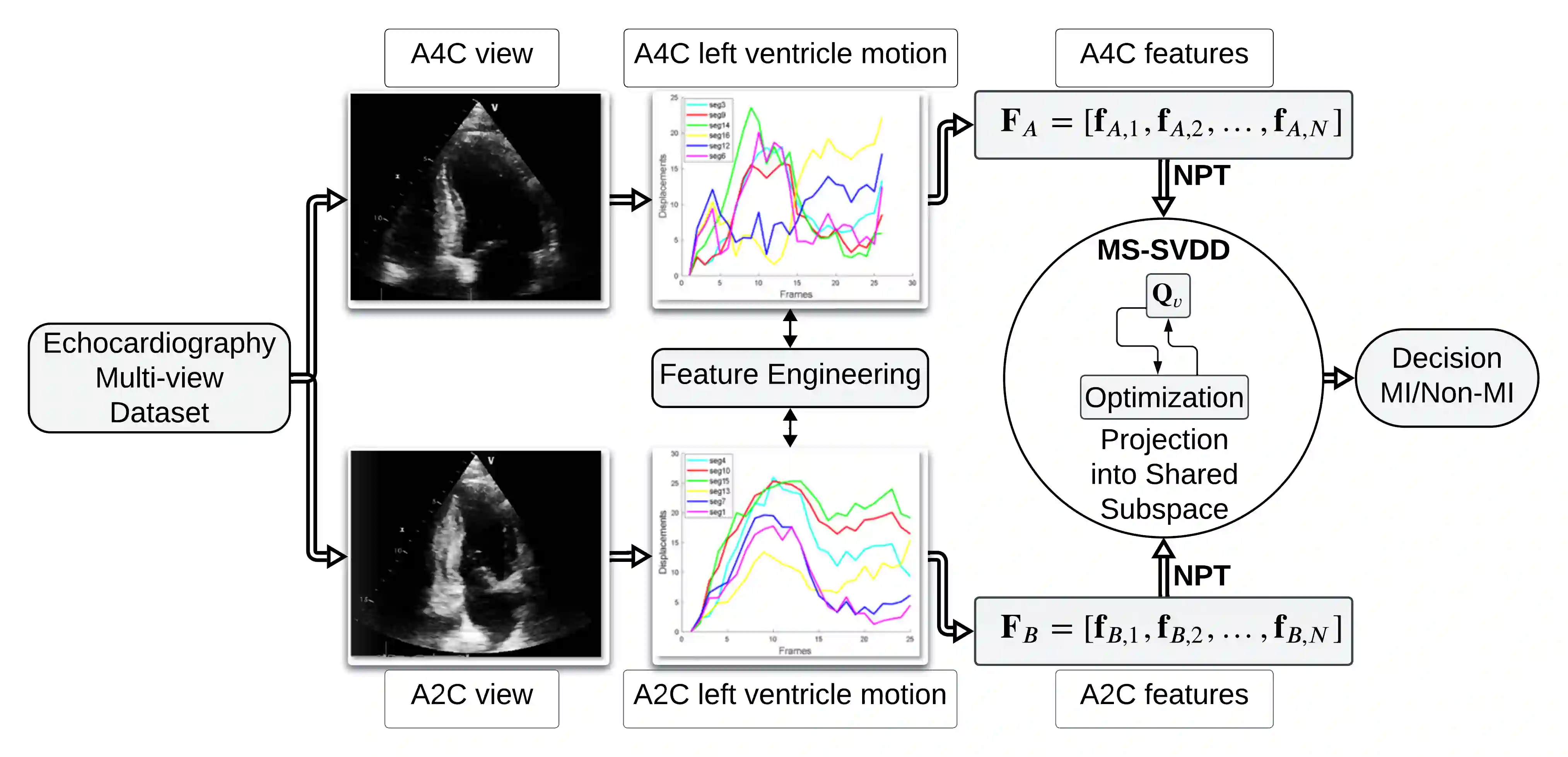 Early detection of myocardial infarction (MI), a critical condition arising from coronary artery disease (CAD), is vital to prevent further myocardial damage. This study introduces a novel method for early MI detection using a one-class classification (OCC) algorithm in echocardiography. Our study overcomes the challenge of limited echocardiography data availability by adopting a novel approach based on Multi-modal Subspace Support Vector Data Description. The proposed technique involves a specialized MI detection framework employing multi-view echocardiography incorporating a composite kernel in the non-linear projection trick, fusing Gaussian and Laplacian sigmoid functions. Additionally, we enhance the update strategy of the projection matrices by adapting maximization for both or one of the modalities in the optimization process. Our method boosts MI detection capability by efficiently transforming features extracted from echocardiography data into an optimized lower-dimensional subspace. The OCC model trained specifically on target class instances from the comprehensive HMC-QU dataset that includes multiple echocardiography views indicates a marked improvement in MI detection accuracy. Our findings reveal that our proposed multi-view approach achieves a geometric mean of 71.24\%, signifying a substantial advancement in echocardiography-based MI diagnosis and offering more precise and efficient diagnostic tools.