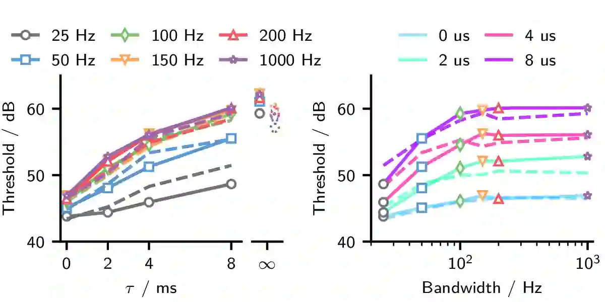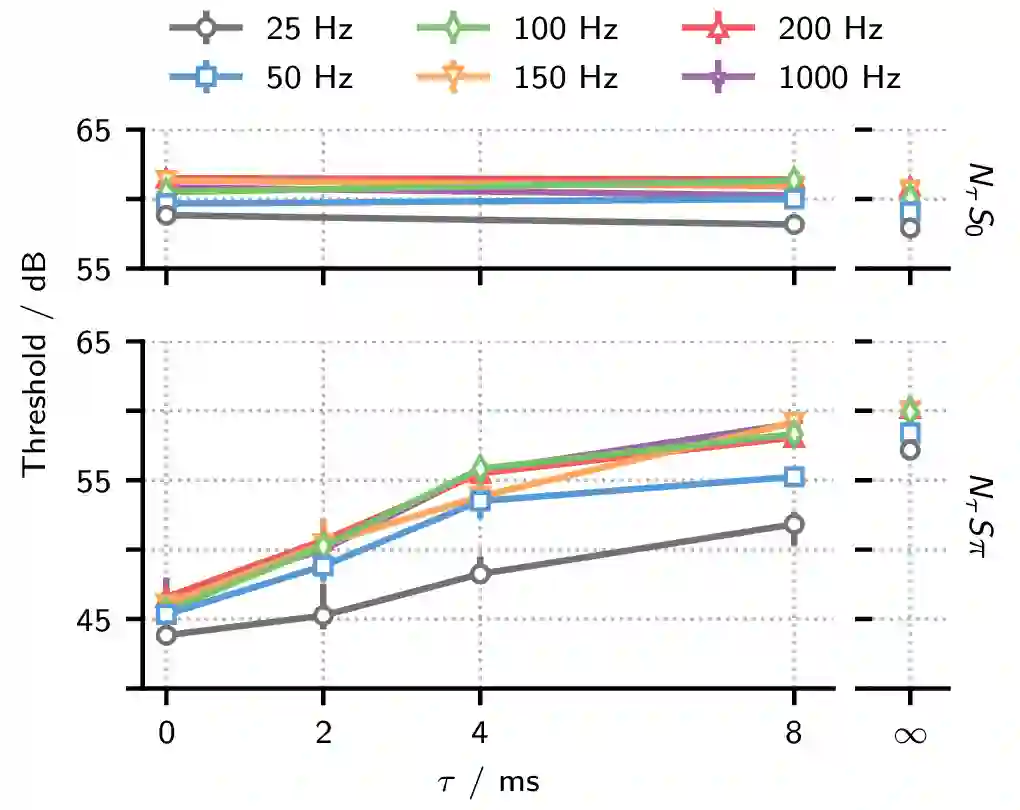 翻译:噪音的间歇阶段与目标音调改善检测阈值之间的差异。 最大遮盖释放量是用于检测丁酸噪声中的抗发音( S$\pi$) (N0) 。 几项研究显示,由于对N0S$\pi$复合体应用了间延,这一效益逐渐下降。 这一下降量是由于噪音的跨度一致性降低所致。 在此, 我们报告在将噪声遮盖时的500赫兹音调的阈值为5至1 000赫兹。 在将噪声带宽度从100至50赫兹和25赫兹时,8毫兹时的遮盖释放量将增加,预期随着带宽的减少而提高时间一致性。 对于100至1000赫兹的带宽,没有观察到任何显著差异,而且这些噪音的检测阈值的延迟依赖度也完全由典型的音调调调的听器过滤器带所设定的时间一致性所设定。 一种最小的硬度二进制模型建议基于跨度阶段差异波动,而不假定延迟线。