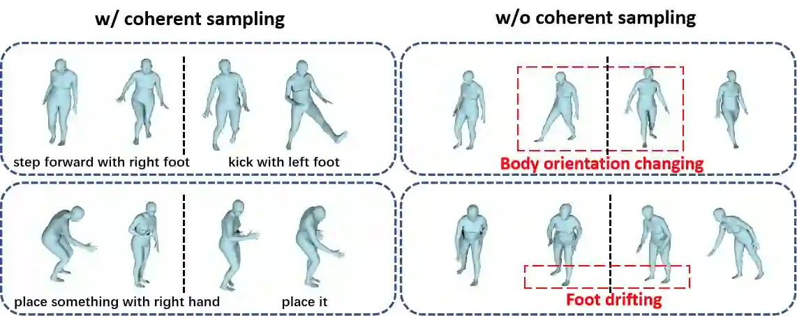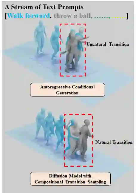 Text-to-motion generation has gained increasing attention, but most existing methods are limited to generating short-term motions that correspond to a single sentence describing a single action. However, when a text stream describes a sequence of continuous motions, the generated motions corresponding to each sentence may not be coherently linked. Existing long-term motion generation methods face two main issues. Firstly, they cannot directly generate coherent motions and require additional operations such as interpolation to process the generated actions. Secondly, they generate subsequent actions in an autoregressive manner without considering the influence of future actions on previous ones. To address these issues, we propose a novel approach that utilizes a past-conditioned diffusion model with two optional coherent sampling methods: Past Inpainting Sampling and Compositional Transition Sampling. Past Inpainting Sampling completes subsequent motions by treating previous motions as conditions, while Compositional Transition Sampling models the distribution of the transition as the composition of two adjacent motions guided by different text prompts. Our experimental results demonstrate that our proposed method is capable of generating compositional and coherent long-term 3D human motions controlled by a user-instructed long text stream. The code is available at \href{https://github.com/yangzhao1230/PCMDM}{https://github.com/yangzhao1230/PCMDM}.