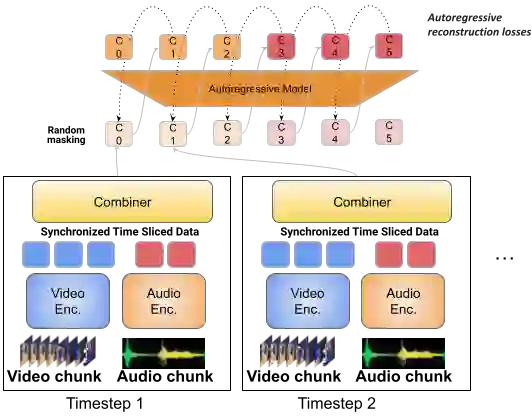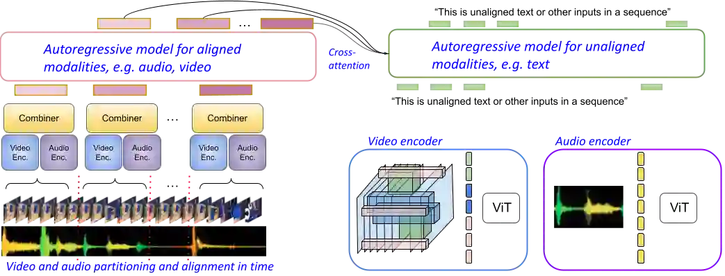 One of the main challenges of multimodal learning is the need to combine heterogeneous modalities (e.g., video, audio, text). For example, video and audio are obtained at much higher rates than text and are roughly aligned in time. They are often not synchronized with text, which comes as a global context, e.g., a title, or a description. Furthermore, video and audio inputs are of much larger volumes, and grow as the video length increases, which naturally requires more compute dedicated to these modalities and makes modeling of long-range dependencies harder. We here decouple the multimodal modeling, dividing it into separate, focused autoregressive models, processing the inputs according to the characteristics of the modalities. We propose a multimodal model, called Mirasol3B, consisting of an autoregressive component for the time-synchronized modalities (audio and video), and an autoregressive component for the context modalities which are not necessarily aligned in time but are still sequential. To address the long-sequences of the video-audio inputs, we propose to further partition the video and audio sequences in consecutive snippets and autoregressively process their representations. To that end, we propose a Combiner mechanism, which models the audio-video information jointly within a timeframe. The Combiner learns to extract audio and video features from raw spatio-temporal signals, and then learns to fuse these features producing compact but expressive representations per snippet. Our approach achieves the state-of-the-art on well established multimodal benchmarks, outperforming much larger models. It effectively addresses the high computational demand of media inputs by both learning compact representations, controlling the sequence length of the audio-video feature representations, and modeling their dependencies in time.