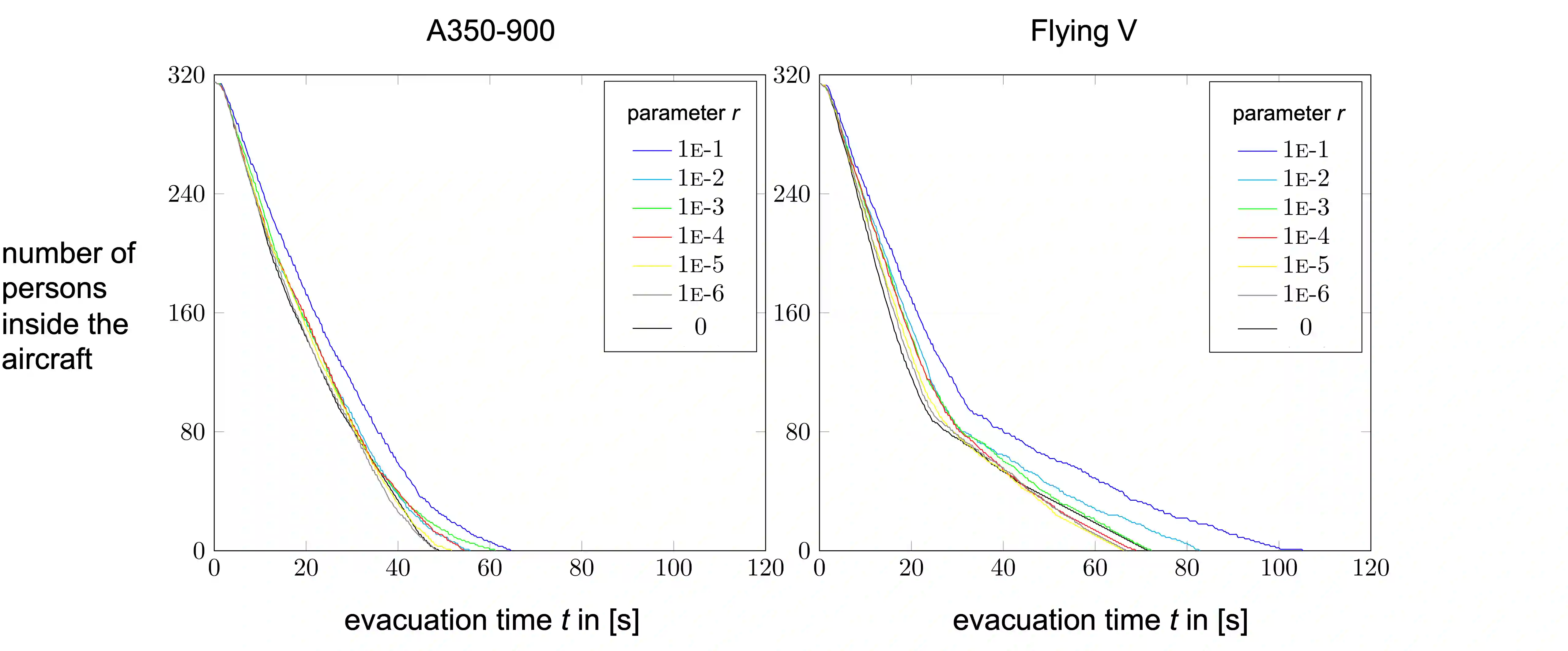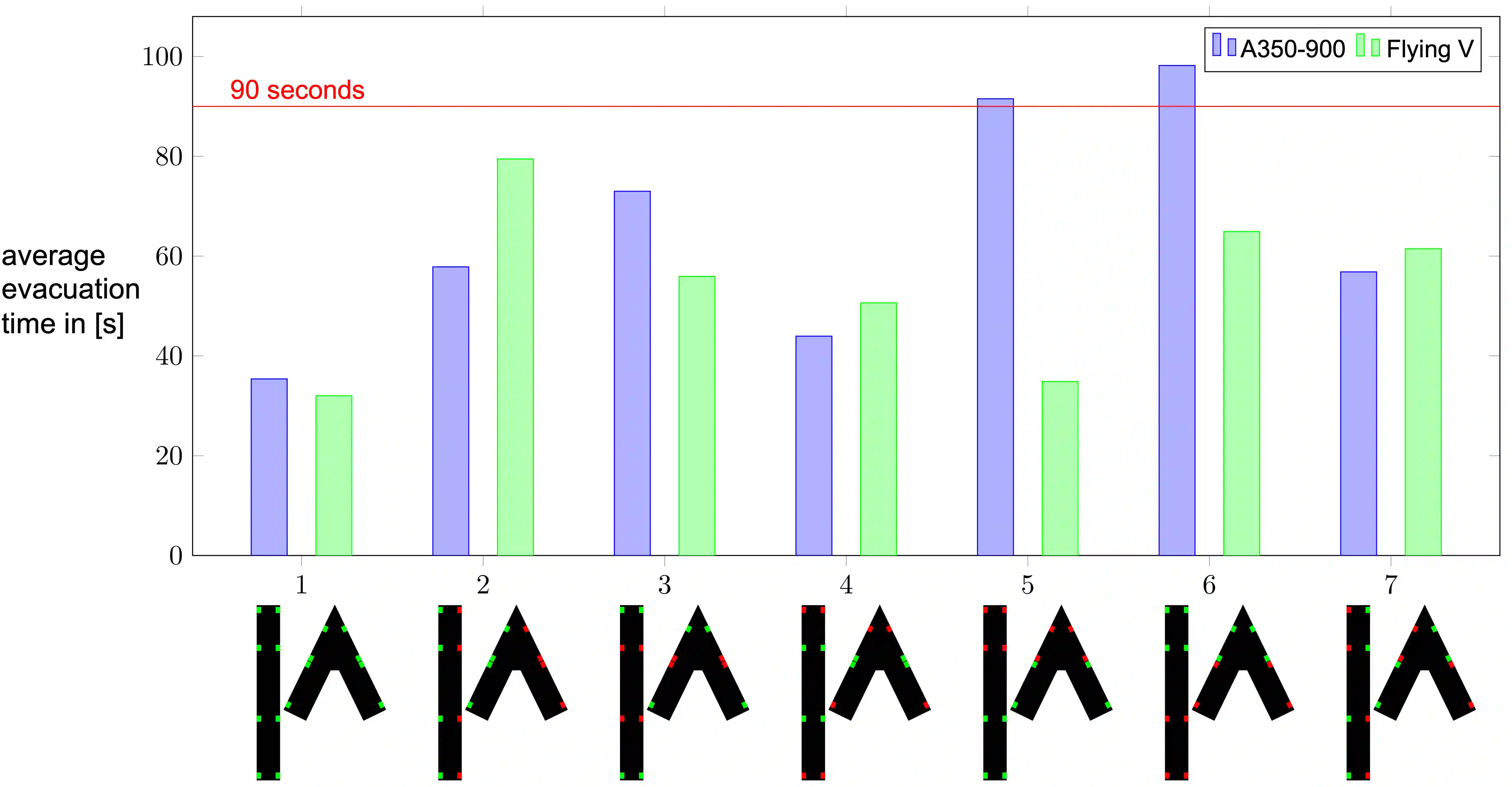 翻译:本研究报告对飞行五号机和空中客车A350-900号机的撤离时间进行了初步比较,根据蜂窝自动成形技术制作了一个简单的模拟工具,以模拟不同封闭式门形的撤离过程。验证条例规定,在发生紧急情况时,所有出口门有一半关闭的民用飞机撤离时间必须少于90秒。本研究结果表明,在乘客需要从飞机前方或后方撤离时,短的V型机舱优于较长的常规参考舱。在V型机舱的乘客需要从飞机左侧或右侧撤离更多时,会出现缺点。目前,提交人创建了进一步调查这些案件的更为详细的模拟模型。