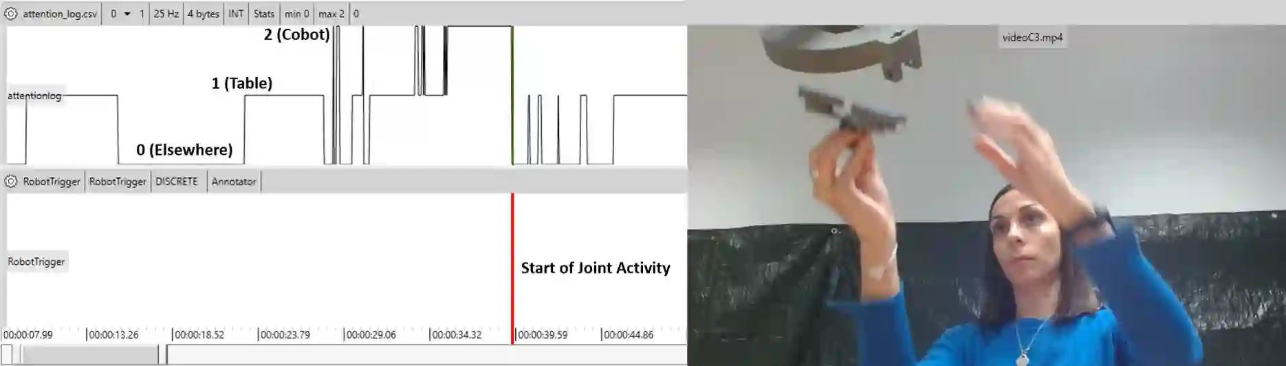 Collaborative robots (cobots) are widely used in industrial applications, yet extensive research is still needed to enhance human-robot collaborations and operator experience. A potential approach to improve the collaboration experience involves adapting cobot behavior based on natural cues from the operator. Inspired by the literature on human-human interactions, we conducted a wizard-of-oz study to examine whether a gaze towards the cobot can serve as a trigger for initiating joint activities in collaborative sessions. In this study, 37 participants engaged in an assembly task while their gaze behavior was analyzed. We employ a gaze-based attention recognition model to identify when the participants look at the cobot. Our results indicate that in most cases (84.88\%), the joint activity is preceded by a gaze towards the cobot. Furthermore, during the entire assembly cycle, the participants tend to look at the cobot around the time of the joint activity. To the best of our knowledge, this is the first study to analyze the natural gaze behavior of participants working on a joint activity with a robot during a collaborative assembly task.