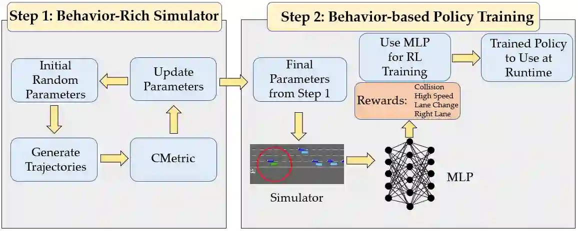 We address the problem of ego-vehicle navigation in dense simulated traffic environments populated by road agents with varying driver behaviors. Navigation in such environments is challenging due to unpredictability in agents' actions caused by their heterogeneous behaviors. We present a new simulation technique consisting of enriching existing traffic simulators with behavior-rich trajectories corresponding to varying levels of aggressiveness. We generate these trajectories with the help of a driver behavior modeling algorithm. We then use the enriched simulator to train a deep reinforcement learning (DRL) policy that consists of a set of high-level vehicle control commands and use this policy at test time to perform local navigation in dense traffic. Our policy implicitly models the interactions between traffic agents and computes safe trajectories for the ego-vehicle accounting for aggressive driver maneuvers such as overtaking, over-speeding, weaving, and sudden lane changes. Our enhanced behavior-rich simulator can be used for generating datasets that consist of trajectories corresponding to diverse driver behaviors and traffic densities, and our behavior-based navigation scheme can be combined with state-of-the-art navigation algorithms.