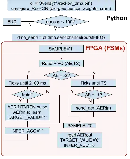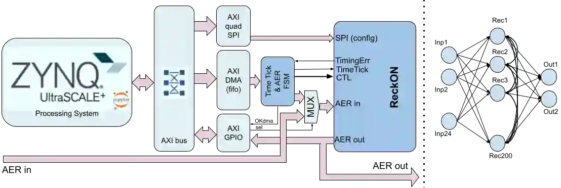 With the rise of artificial intelligence, biological neuron models are being used to implement neural networks that can learn certain tasks after a training phase. One type of such networks are spiking neural networks (SNNs) that rely on a simplified model for biological neurons, the Integrate and Fire neuron. Several accelerators have emerged to implement SNNs with this kind of neuron. The ReckON system is one of these that allows both the training and execution of a recurrent SNN. The ReckON architecture, implemented on a custom ASIC, can be fully described using a hardware description language. In this work, we adapt the Verilog description to implement it on a Xilinx Multiprocessor System on Chip system (MPSoC). We present the circuits required for the efficient operation of the system, and a Python framework to use it on the Pynq ZU platform. We validate the architecture and implementation in two different scenarios, and show how the simulated accuracy is preserved with a peak performance of 3.8M events processed per second.