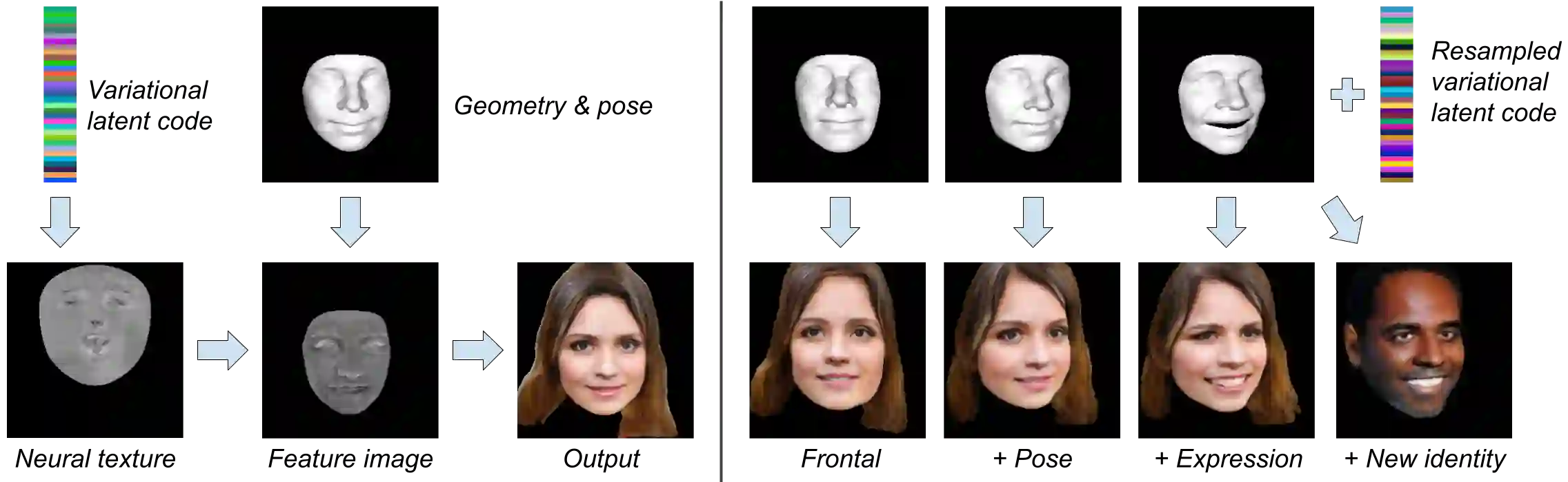 翻译:深基因模型最近展示了将人类面部的光现实图像与新特征合成的能力。这些技术的广泛应用所面临的一项关键挑战是如何独立控制具有语义意义的参数:外观、头部姿势、脸形和面部表情。在本文件中,我们建议VariTex(根据我们所知的最好的方法)学习神经面质的变异潜在空间的第一个方法,从而可以对新特征进行取样。我们将这种基因模型与面部模版模型结合起来,并获得对头部面容和面部表情的明确控制。为了生成完整的人类头部图像,我们建议了一个添加解码器,以产生其他貌似可信的细节,如发型。一个新颖的培训计划设置了一个独立的潜在空间,从而可以学习在潜在代码和外表调节区域之间的一对一的地图。由此产生的方法可以产生几何上一致的新身份图像,从而能够对头部面容、面形和面部表达方式进行精细的控制,从而便利一系列广泛的下游任务,例如取样新型身份、重新定位、表达方式转移等等。