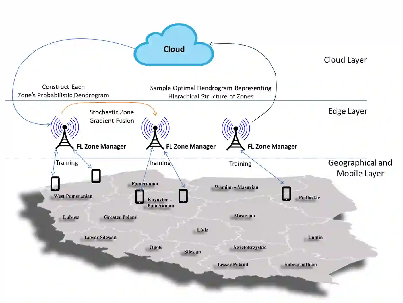 翻译:本文提出随机地理梯度融合(SGFusion),一种利用移动用户地理信息的新型联邦学习训练算法。SGFusion将移动设备采集的数据映射到地理区域,并为每个区域训练一个联邦学习模型,该模型能很好地适应该区域用户的数据和行为。SGFusion将地理区域间基于本地数据的相关性建模为通过马尔可夫链蒙特卡洛采样优化的层次随机图(HRG)。在每个训练步骤中,每个区域将其本地梯度与从HRG采样的少量其他区域推导出的梯度进行融合。该方法通过具有自注意力权重的概率随机梯度融合过程,实现地理区域间的知识融合与共享,使得“更相似”的区域具有“更高概率”以“更大注意力权重”共享梯度。SGFusion在未引入过高计算成本的情况下显著提升了模型效用。基于6个国家采集的心率预测数据集进行的广泛理论与实证结果表明,采用SGFusion训练的模型能以有界期望误差收敛,与现有方法相比在所有国家均显著提升效用,且未对系统可扩展性造成明显负担。