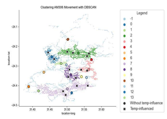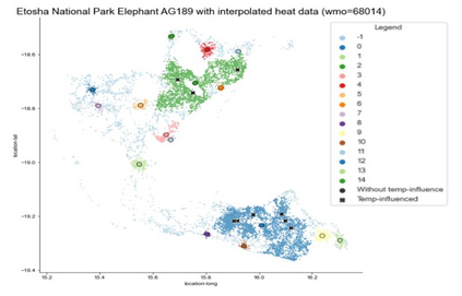 Understanding the movement of animals is crucial to conservation efforts. Past research often focuses on factors affecting movement, rather than locations of interest that animals return to or habitat. We explore the use of clustering to identify locations of interest to African Elephants in regions of Sub-Saharan Africa. Our analysis was performed using publicly available datasets for tracking African elephants at Kruger National Park (KNP), South Africa; Etosha National Park, Namibia; as well as areas in Burkina Faso and the Congo. Using the DBSCAN and KMeans clustering algorithms, we calculate clusters and centroids to simplify elephant movement data and highlight important locations of interest. Through a comparison of feature spaces with and without temperature, we show that temperature is an important feature to explain movement clustering. Recognizing the importance of temperature, we develop a technique to add external temperature data from an API to other geospatial datasets that would otherwise not have temperature data. After addressing the hurdles of using external data with marginally different timestamps, we consider the quality of this data, and the quality of the centroids of the clusters calculated based on this external temperature data. Finally, we overlay these centroids onto satellite imagery and locations of human settlements to validate the real-life applications of the calculated centroids to identify locations of interest for elephants. As expected, we confirmed that elephants tend to cluster their movement around sources of water as well as some human settlements, especially those with water holes. Identifying key locations of interest for elephants is beneficial in predicting the movement of elephants and preventing poaching. These methods may in the future be applied to other animals beyond elephants to identify locations of interests for them.