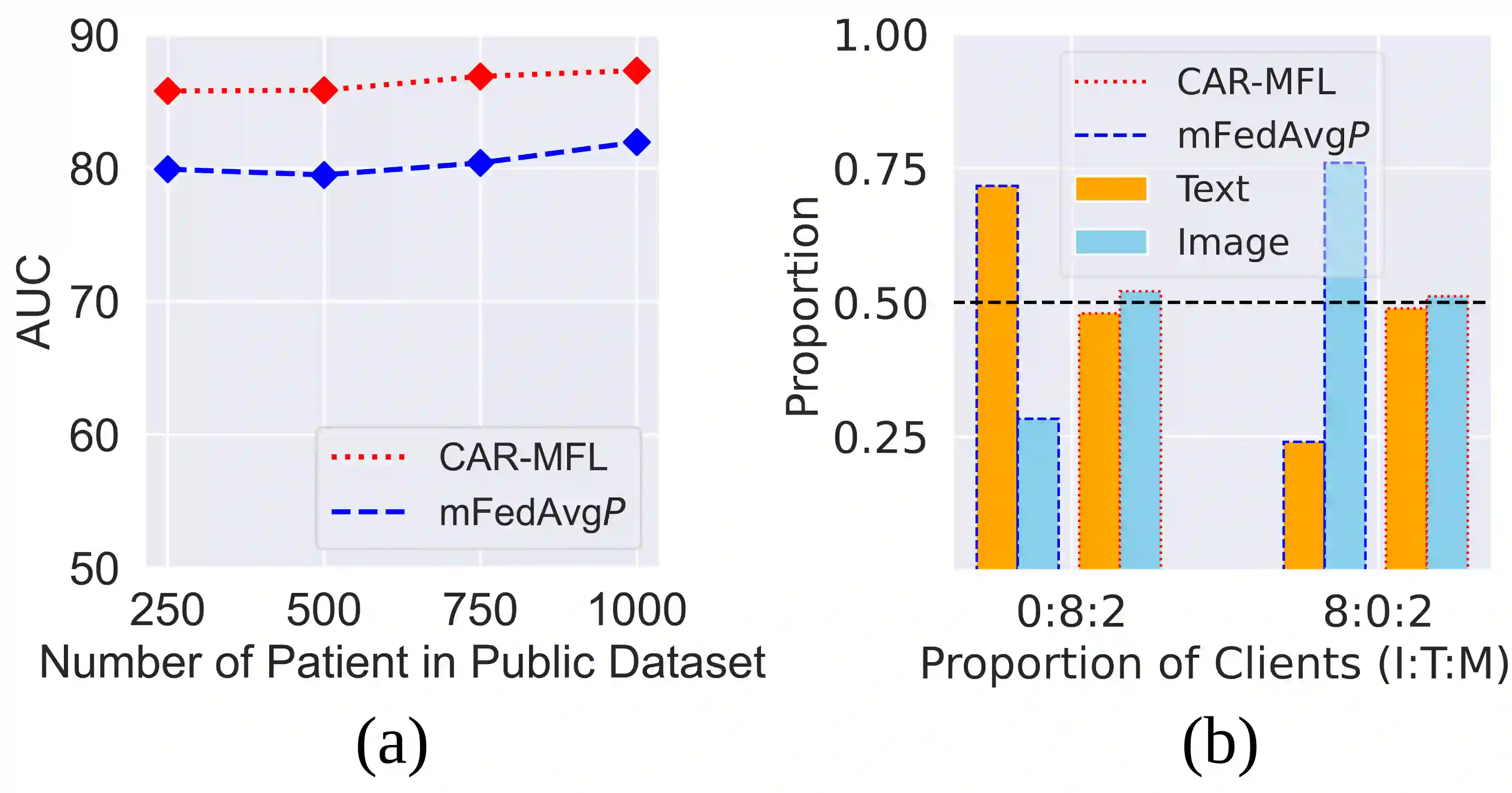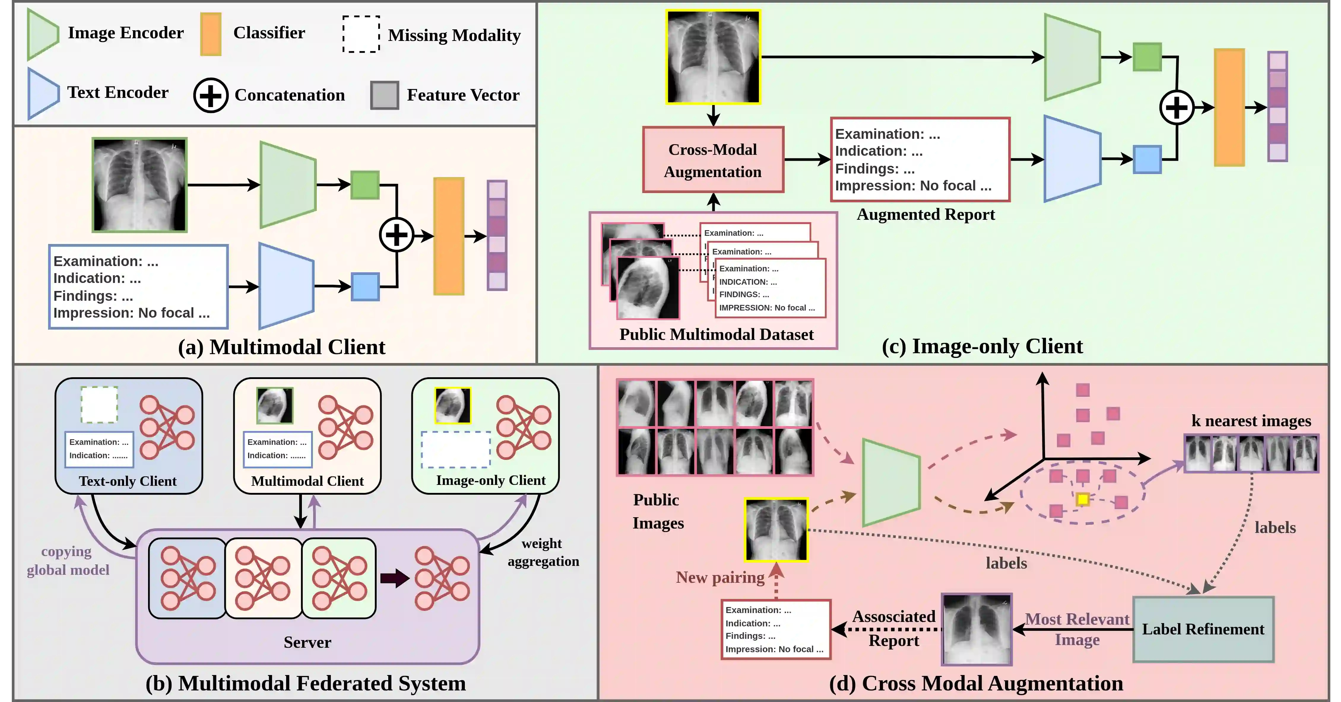 Multimodal AI has demonstrated superior performance over unimodal approaches by leveraging diverse data sources for more comprehensive analysis. However, applying this effectiveness in healthcare is challenging due to the limited availability of public datasets. Federated learning presents an exciting solution, allowing the use of extensive databases from hospitals and health centers without centralizing sensitive data, thus maintaining privacy and security. Yet, research in multimodal federated learning, particularly in scenarios with missing modalities a common issue in healthcare datasets remains scarce, highlighting a critical area for future exploration. Toward this, we propose a novel method for multimodal federated learning with missing modalities. Our contribution lies in a novel cross-modal data augmentation by retrieval, leveraging the small publicly available dataset to fill the missing modalities in the clients. Our method learns the parameters in a federated manner, ensuring privacy protection and improving performance in multiple challenging multimodal benchmarks in the medical domain, surpassing several competitive baselines. Code Available: https://github.com/bhattarailab/CAR-MFL