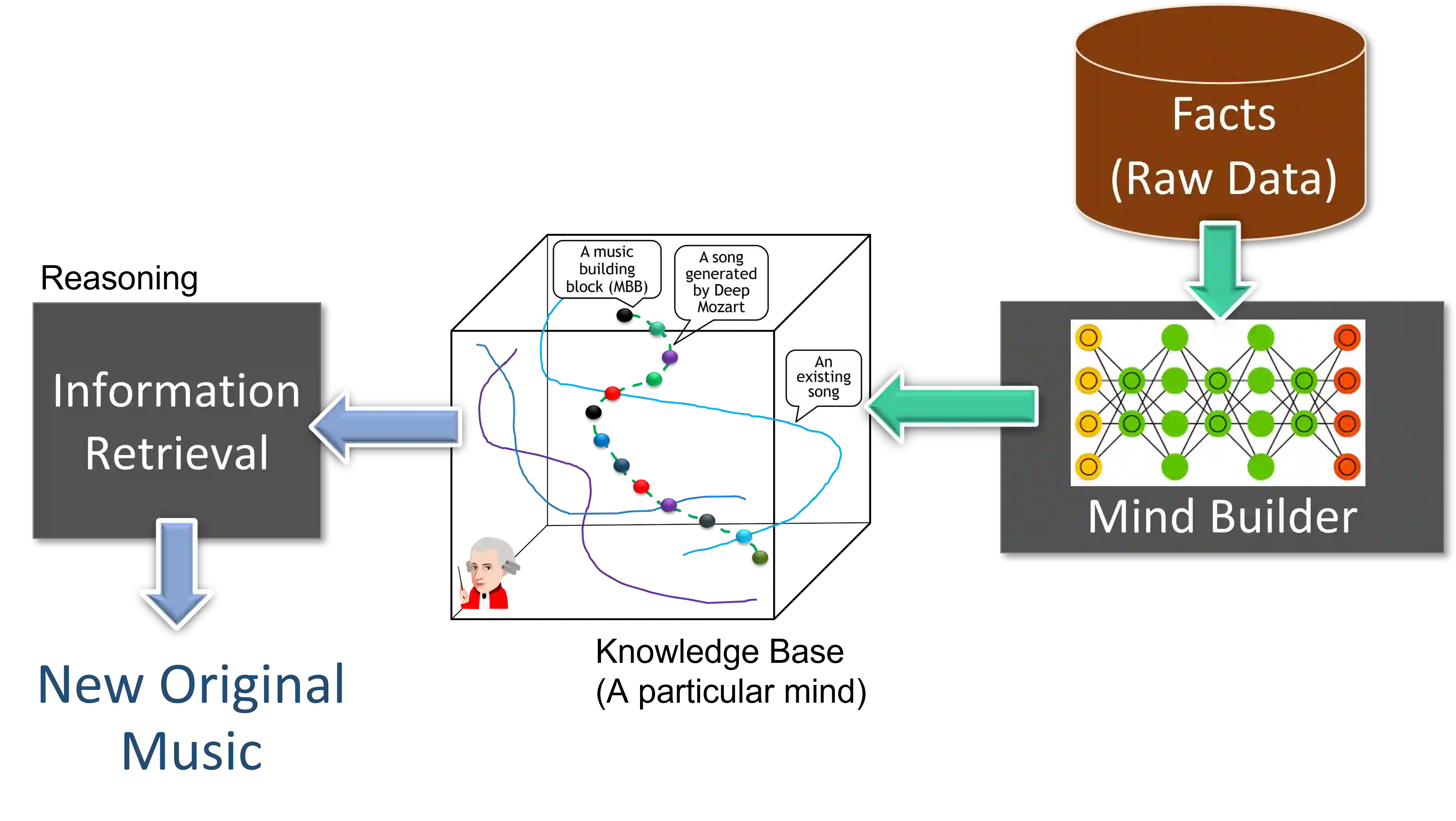 There are two aspects of machine learning and artificial intelligence: (1) interpreting information, and (2) inventing new useful information. Much advance has been made for (1) with a focus on pattern recognition techniques (e.g., interpreting visual data). This paper focuses on (2) with intelligent duplication (ID) for invention. We explore the possibility of learning a specific individual's creative reasoning in order to leverage the learned expertise and talent to invent new information. More specifically, we employ a deep learning system to learn from the great composer Beethoven and capture his composition ability in a hash-based knowledge base. This new form of knowledge base provides a reasoning facility to drive the music composition through a novel music generation method.