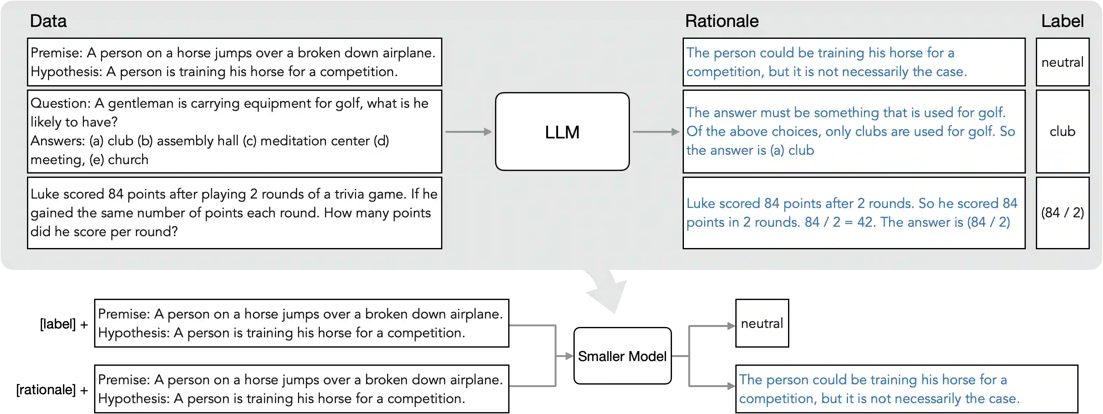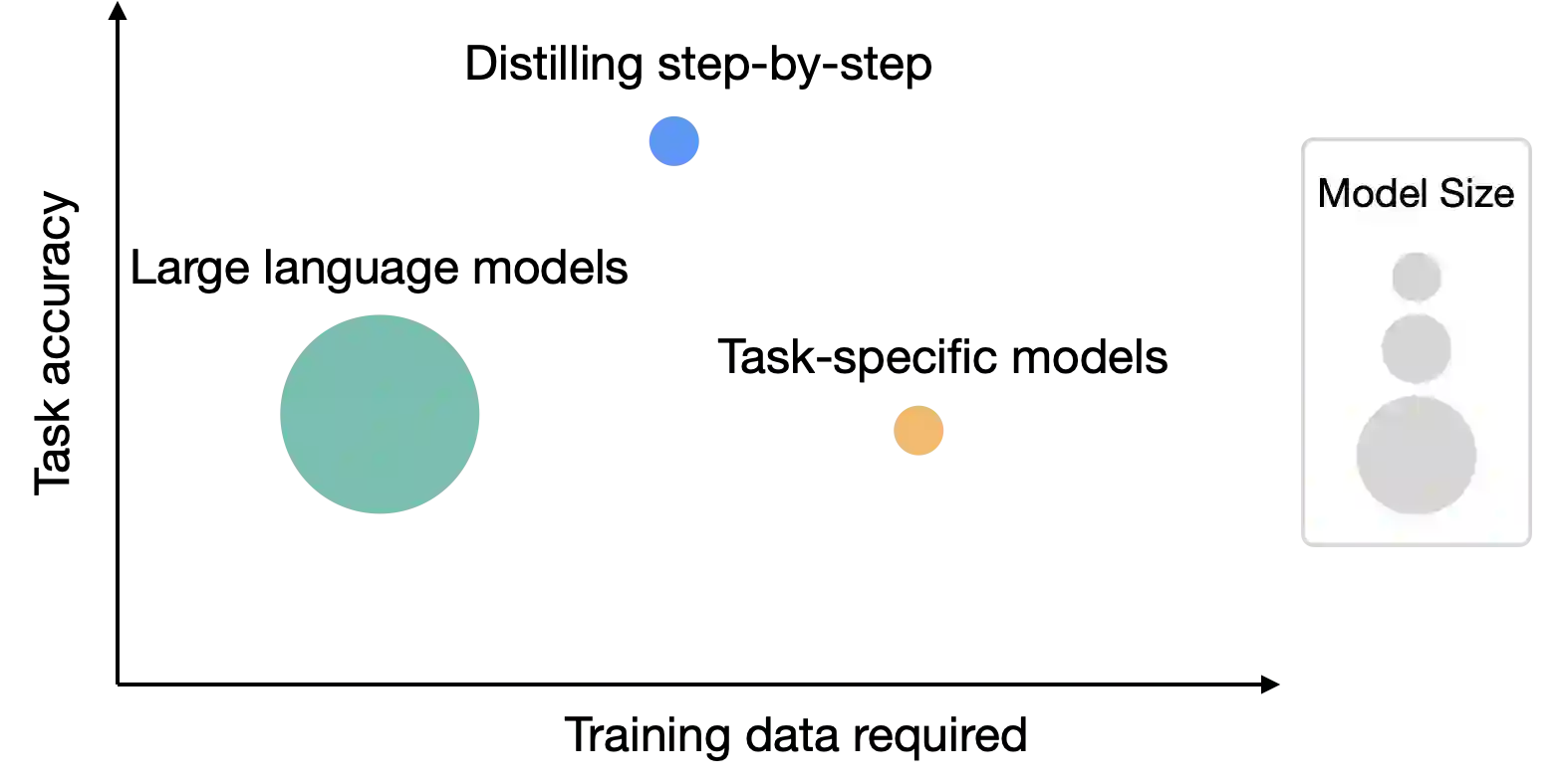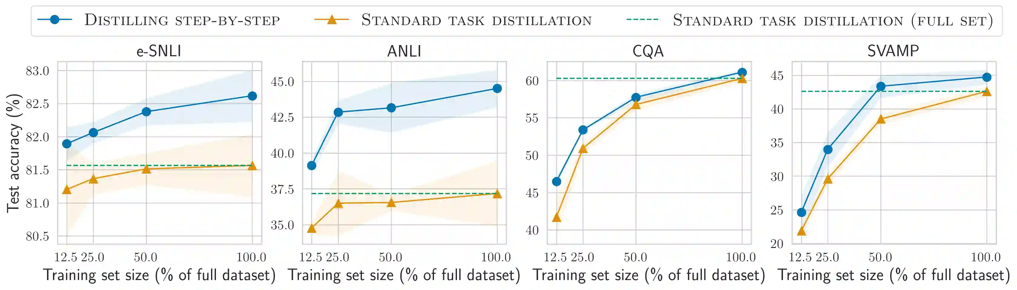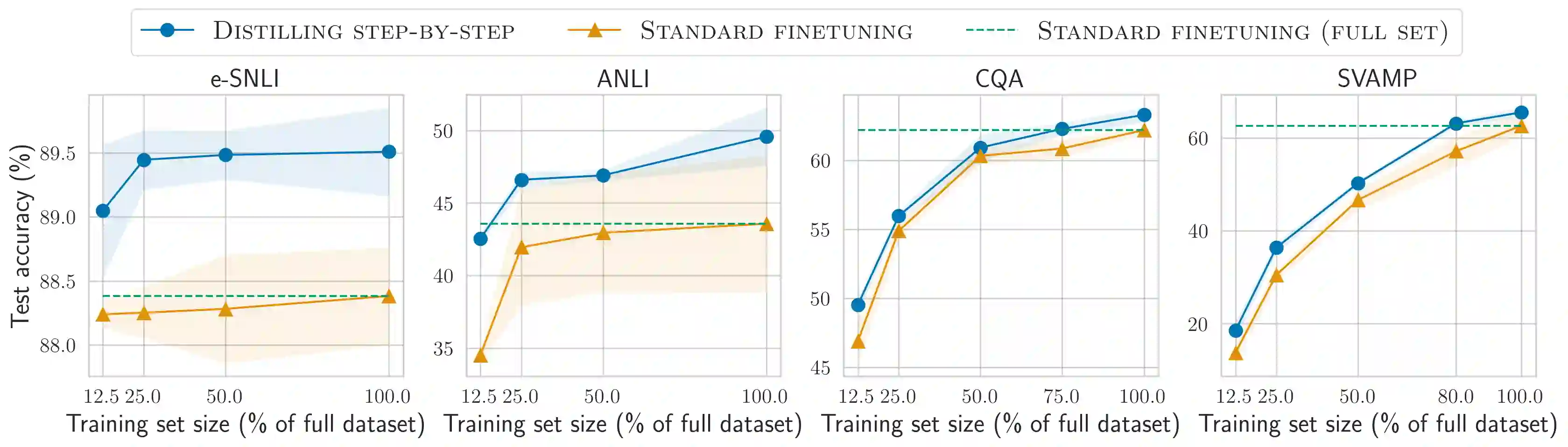 Deploying large language models (LLMs) is challenging because they are memory inefficient and compute-intensive for practical applications. In reaction, researchers train smaller task-specific models by either finetuning with human labels or distilling using LLM-generated labels. However, finetuning and distillation require large amounts of training data to achieve comparable performance to LLMs. We introduce Distilling step-by-step, a new mechanism that (a) trains smaller models that outperform LLMs, and (b) achieves so by leveraging less training data needed by finetuning or distillation. Our method extracts LLM rationales as additional supervision for training small models within a multi-task framework. We present three findings across 4 NLP benchmarks: First, compared to both finetuning and distillation, our mechanism achieves better performance with much fewer labeled/unlabeled training examples. Second, compared to few-shot prompted LLMs, we achieve better performance using substantially smaller model sizes. Third, we reduce both the model size and the amount of data required to outperform LLMs; our finetuned 770M T5 model outperforms the few-shot prompted 540B PaLM model using only 80% of available data on a benchmark, whereas standard finetuning the same T5 model struggles to match even by using 100% of the dataset. We release the code at: https://github.com/google-research/distilling-step-by-step .