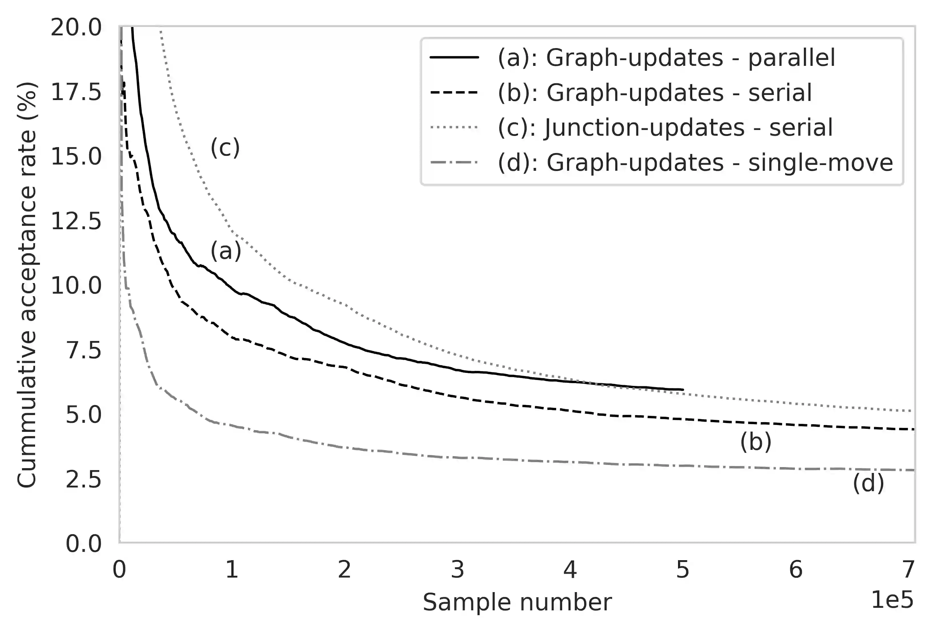 翻译:对非方向图形模型的贝叶斯推断大多限于可分解图形的类别,因为它们拥有丰富的属性,因此可以应对高维问题。虽然参数推断在此设置中是直截了当的,但推断基本图形是一个由难以计算地探索可分解图形空间而引发的挑战。这项工作为解决这一问题作出了两项贡献。首先,我们为多端扰动保持图的可分解性提供了足够和必要的条件。利用这些,我们确定一个简单的分区类别,将所有边缘扰动有效分类,以是否保持可分解性。第二,我们提议一个新的平行的不可逆的马尔科夫链条蒙特卡洛采样器,用于分布于图形的交接树图示上,每一步都同时执行分区内的所有边缘扰动。通过模拟,我们展示了我们新的边缘扰动条件和分区类别的效率。我们发现,平行的采样器与单一移动变异性软件包相比,可以产生更好的混合特性。我们现有的工作方式是使用。