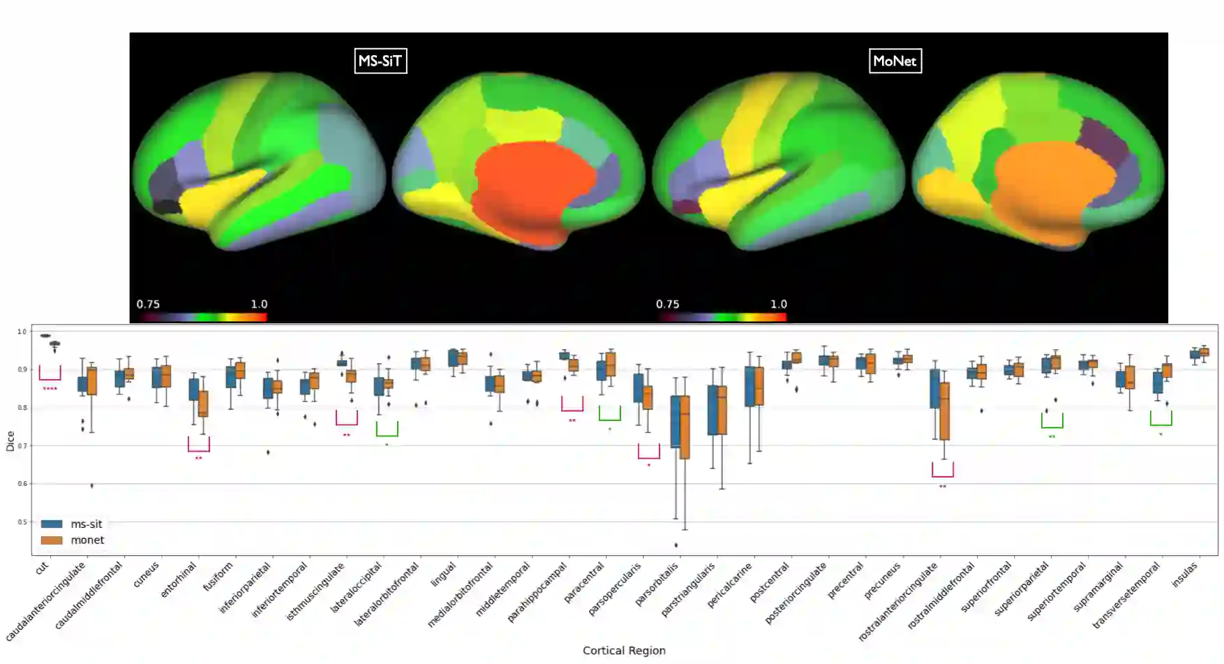 翻译:表面网格是表示人类皮层结构和功能信息的优选领域,但其复杂的拓扑和几何形状对深度学习分析提出了重大挑战。虽然变形器在序列到序列学习方面表现出色,尤其是对于其中卷积操作的平移非平凡时,但自我注意操作的二次成本仍然是许多密集预测任务的障碍。受最新的多尺度模型化,带有视觉变换器的启发,我们引入了多尺度表面视觉变换器(MS-SiT)作为表面深度学习的骨干架构。自我注意机制应用于局部网格窗口中,以允许对底层数据进行高分辨率采样,而移位窗口策略则提高了窗口之间信息共享的效果。相邻的补丁被逐层合并,使得MS-SiT能够学习可适用于任何预测任务的分层表示。结果表明,使用发展中人类连接组学(dHCP)数据集对新生儿表型预测任务进行评估时,MS-SiT的表现优于现有的表面深度学习方法。此外,将MS-SiT骨干架构嵌入到用于表面分割的U型架构中,在UK Biobank (UKB)和手工注释的MindBoggle数据集上展现了竞争性的结果。代码和训练模型公开在 https://github.com/metrics-lab/surface-vision-transformers。