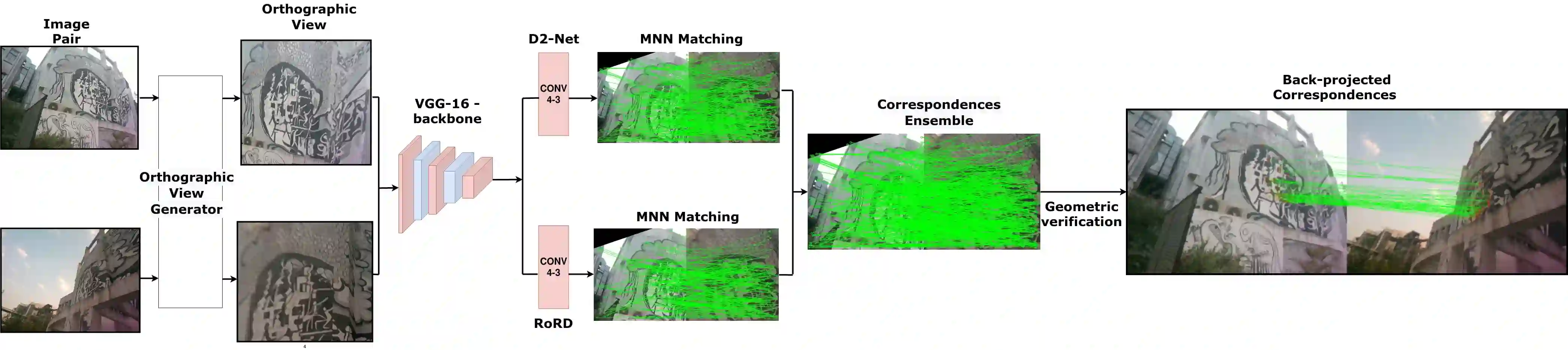 The use of local detectors and descriptors in typical computer vision pipelines work well until variations in viewpoint and appearance change become extreme. Past research in this area has typically focused on one of two approaches to this challenge: the use of projections into spaces more suitable for feature matching under extreme viewpoint changes, and attempting to learn features that are inherently more robust to viewpoint change. In this paper, we present a novel framework that combines learning of invariant descriptors through data augmentation and orthographic viewpoint projection. We propose rotation-robust local descriptors, learnt through training data augmentation based on rotation homographies, and a correspondence ensemble technique that combines vanilla feature correspondences with those obtained through rotation-robust features. Using a range of benchmark datasets as well as contributing a new bespoke dataset for this research domain, we evaluate the effectiveness of the proposed approach on key tasks including pose estimation and visual place recognition. Our system outperforms a range of baseline and state-of-the-art techniques, including enabling higher levels of place recognition precision across opposing place viewpoints and achieves practically-useful performance levels even under extreme viewpoint changes.