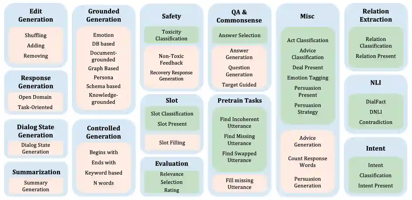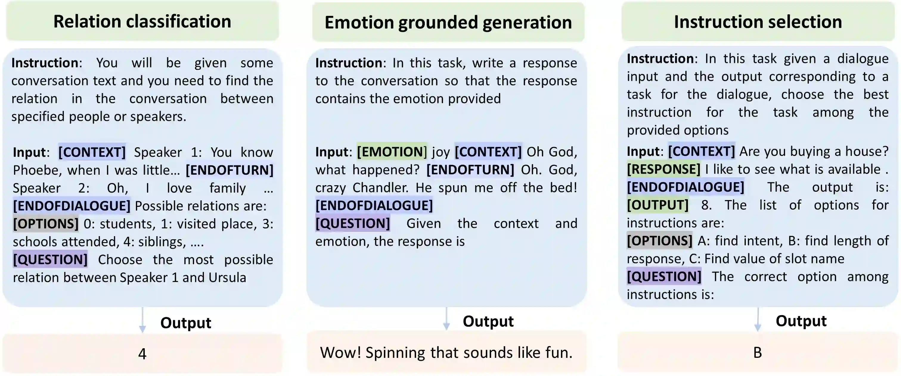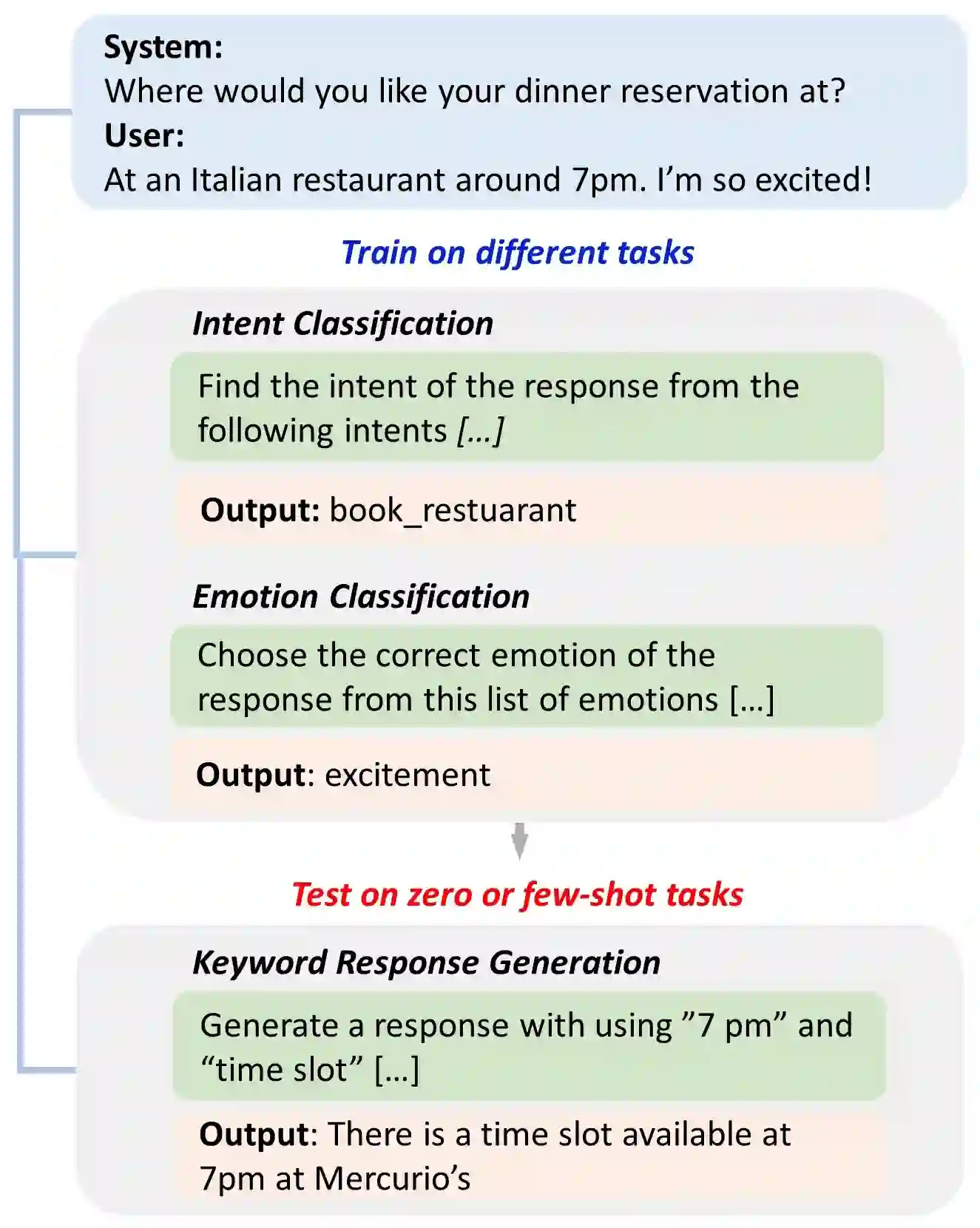 翻译:教学调整是国家语言平台的一个新兴范例,其中自然语言指令与语言模型一起被利用,以促成在未见任务上零发性能; 已经展示了相关指令,以便能够在大型和小型语言模型的无形任务和数据集上取得良好业绩; 对话是一个特别有趣的领域,以探索教学调整,因为对话系统执行与语言有关的多种任务(例如,自然语言理解和生成、特定领域的互动),然而,对与对话有关的任务没有进行系统探索; 我们引入了教学调整框架 " 指令 ",即对话指导调整框架,由来自59个公开的对话框数据集创建的统一文本对文本格式的48个不同对话任务储存库组成; 下一步,我们探索对不同对话任务中指令调整的模型的交叉任务概括性能力。 我们的分析表明,指令Dial使得在对话评估和意向检测等未知数据集和任务上能够很好地进行零发性性性工作,甚至可以在几眼环境中进行更好的业绩。 为确保模型遵循指令,我们引入新的元任务。 我们用拟议框架为多式对话任务设定基准零发和几发式。
