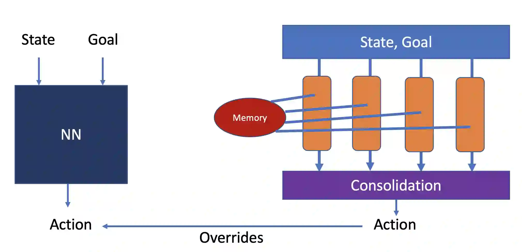 Model-based next state prediction and state value prediction are slow to converge. To address these challenges, we do the following: i) Instead of a neural network, we do model-based planning using a parallel memory retrieval system (which we term the slow mechanism); ii) Instead of learning state values, we guide the agent's actions using goal-directed exploration, by using a neural network to choose the next action given the current state and the goal state (which we term the fast mechanism). The goal-directed exploration is trained online using hippocampal replay of visited states and future imagined states every single time step, leading to fast and efficient training. Empirical studies show that our proposed method has a 92% solve rate across 100 episodes in a dynamically changing grid world, significantly outperforming state-of-the-art actor critic mechanisms such as PPO (54%), TRPO (50%) and A2C (24%). Ablation studies demonstrate that both mechanisms are crucial. We posit that the future of Reinforcement Learning (RL) will be to model goals and sub-goals for various tasks, and plan it out in a goal-directed memory-based approach.