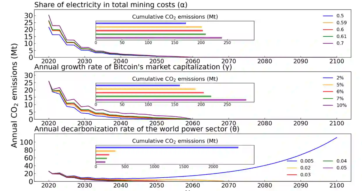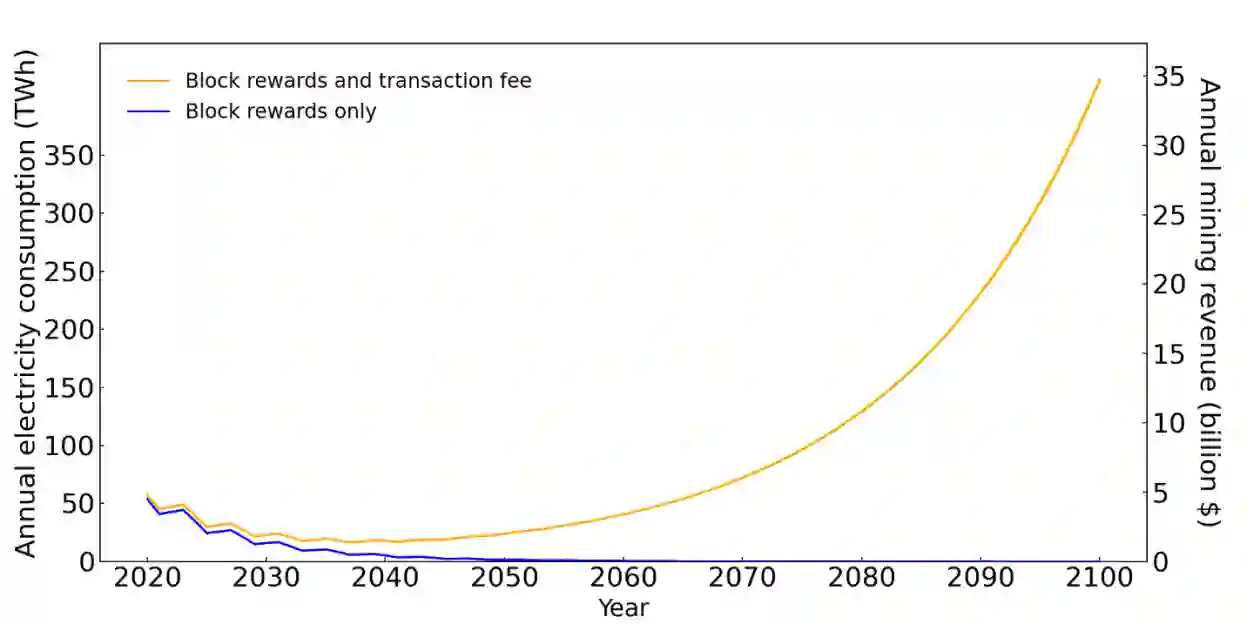 翻译:Bitcoin的碳足迹引起了广泛的注意,但Bitcoin的碳足迹对气候的长期影响仍然不确定。 我们在这里提出了一个框架,以克服先前估算和Bitcoin项目在Bitcoin的电力消费和碳足迹的长期不确定性。 如果我们假设Bitcoin的市场资本化增长与黄金的市场资本化一致,我们发现,Bitcoin的年电力消耗量在2020年至2100年间可能从60吨增加到400吨。Bitcoin的未来碳足迹在很大程度上取决于电力部门的去碳化路径。如果电力部门到2050年实现碳中和,Bitcoin的碳足迹已经达到顶峰。然而,在“一切照旧”的假设中,排放总量高达2千吨,到2100年,相当于2019年全球排放量的7%。 但是,2020年底Bitcoin的价格上涨表明,2021年市场资本化的逐步发展可以产生100吨以上TWh, 并导致到2100年超过5千兆吨的累计排放量。 因此,我们还讨论减少Bitcoin未来碳足迹的政策工具。