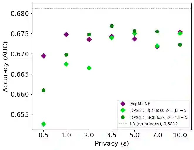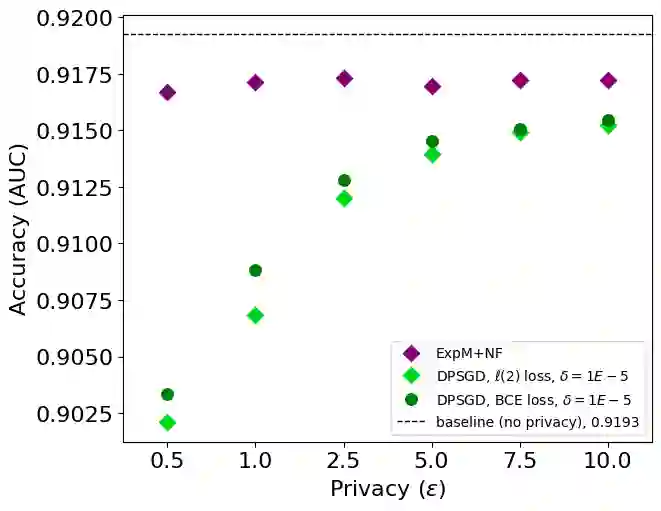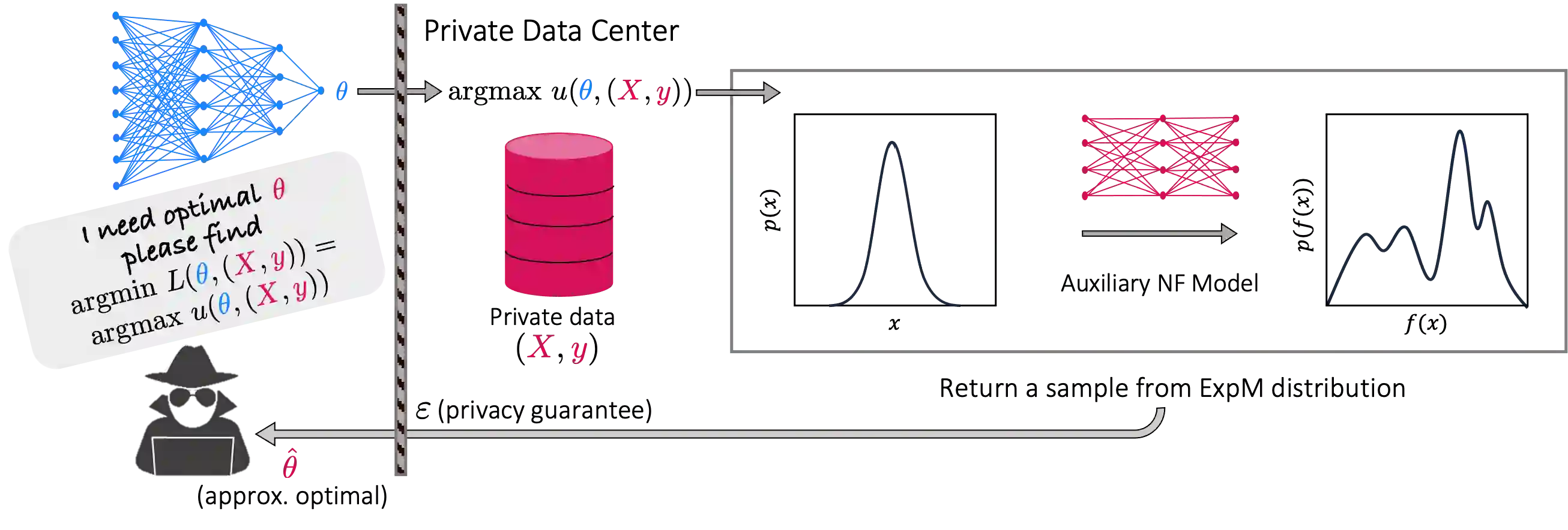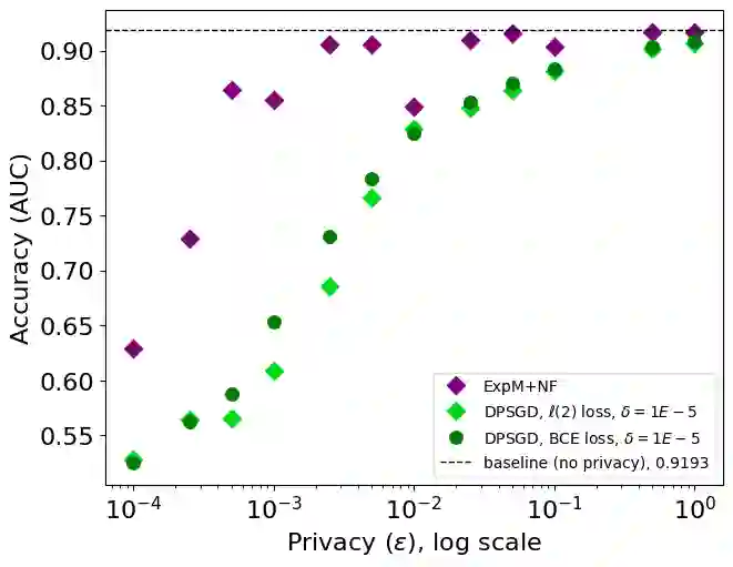 In this pioneering work we formulate ExpM+NF, a method for training machine learning (ML) on private data with pre-specified differentially privacy guarantee $\varepsilon>0, \delta=0$, by using the Exponential Mechanism (ExpM) and an auxiliary Normalizing Flow (NF). We articulate theoretical benefits of ExpM+NF over Differentially Private Stochastic Gradient Descent (DPSGD), the state-of-the-art (SOTA) and de facto method for differentially private ML, and we empirically test ExpM+NF against DPSGD using the SOTA implementation (Opacus with PRV accounting) in multiple classification tasks on the Adult Dataset (census data) and MIMIC-III Dataset (electronic healthcare records) using Logistic Regression and GRU-D, a deep learning recurrent neural network with ~20K-100K parameters. In all experiments, ExpM+NF achieves greater than 93% of the non-private training accuracy (AUC) for $\varepsilon \in [1\mathrm{e}{-3}, 1]$, exhibiting greater accuracy (higher AUC) and privacy (lower $\varepsilon$ with $\delta=0$) than DPSGD. Differentially private ML generally considers $\varepsilon \in [1,10]$ to maintain reasonable accuracy; hence, ExpM+NF's ability to provide strong accuracy for orders of magnitude better privacy (smaller $\varepsilon$) substantially pushes what is currently possible in differentially private ML. Training time results are presented showing ExpM+NF is comparable to (slightly faster) than DPSGD. Code for these experiments will be provided after review. Limitations and future directions are provided.