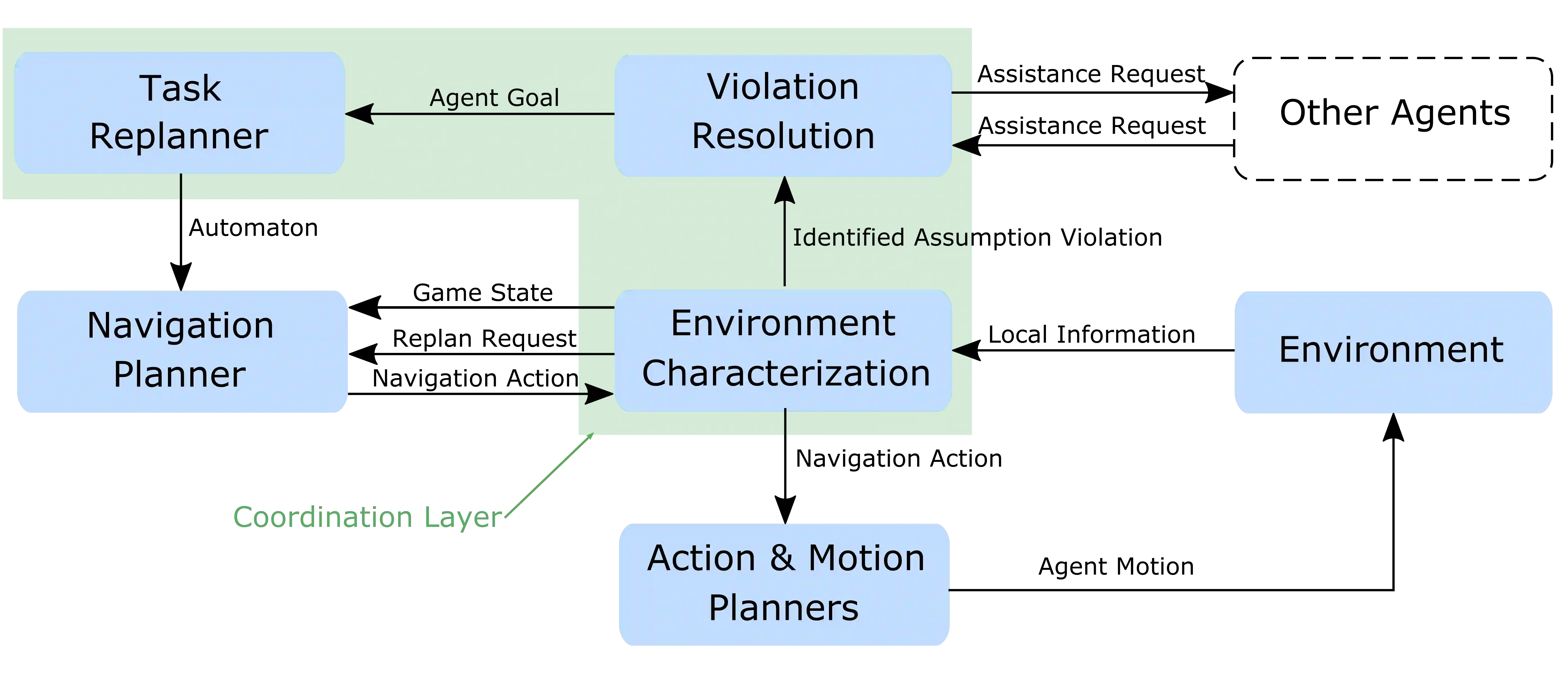翻译:在本文中,我们引入了一个高级控制器综合框架,使不同物剂小组能够互相协助解决在运行时出现的环境冲突。这种解决冲突的方法建立在基于时间的基于逻辑的被动合成基础上,以保证在特定环境假设下安全和完成任务。在多种物剂系统中,每个物剂都有望完成自己的任务,为全球团队的目标服务。然而,在运行时,一个物剂可能遇到非模型化障碍(如门或墙),使其无法完成自己的任务。为解决这一问题,我们利用其他不同物剂的能力来消除障碍。提议建立一个控制器框架,在发现这种情况时,将能够解决适当障碍以达到所需目标的物剂重新定位。使用一套涉及双型机器人Digit和四分立器的案例研究来评估控制器在行动中的表现。此外,我们实施了关于物理多剂机器人系统的拟议框架,以证明其在现实世界应用方面的可行性。