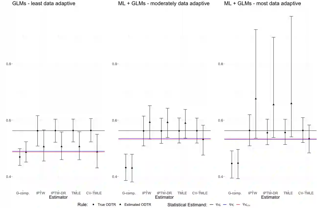 翻译:根据(最优)动态治疗规则,评估这一规则可能有意义,也就是说,要问一个因果关系问题:预期结果是什么?在本文件中,我们研究估计者的实际价值大致如下:1) 美元为美元,已知的动态治疗规则2;真实的、未知的最佳动态治疗规则(ODTR);3 估计的DDTR,即所谓的“数据适应参数”,其真实价值取决于抽样。利用点处理数据的模拟,我们特别调查:(1) 越来越准确地估计每个对象都按照该规则得到治疗?在本文中,我们研究了估算者的实际价值的预期结果是什么?1,我们研究了估算者的实际价值大约为:1美元为1美元,1美元为美元,美元;3)基于CV-TMLE的样本分裂对于准确推断的重要性。在考虑的模拟中,使用经过交叉验证的参数估计的最大可能性估计值(CV-TRELE),我们具体地调查:(1) 越来越精确的对调值进行数据评估的影响;(2) 使用半分数有效估量的DNA数据,使用这些定量数据的对比和估算者对数值的估算值是使用。