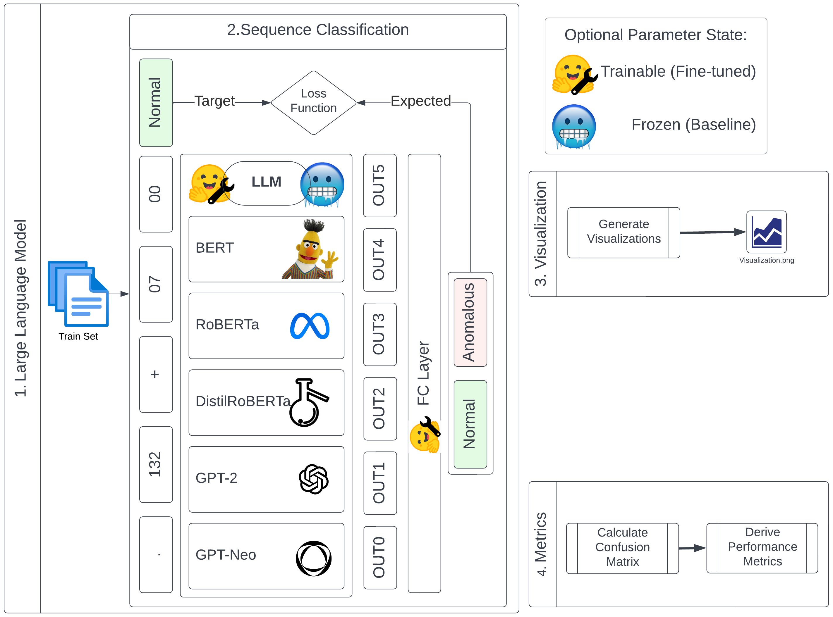 Large Language Models (LLM) continue to demonstrate their utility in a variety of emergent capabilities in different fields. An area that could benefit from effective language understanding in cybersecurity is the analysis of log files. This work explores LLMs with different architectures (BERT, RoBERTa, DistilRoBERTa, GPT-2, and GPT-Neo) that are benchmarked for their capacity to better analyze application and system log files for security. Specifically, 60 fine-tuned language models for log analysis are deployed and benchmarked. The resulting models demonstrate that they can be used to perform log analysis effectively with fine-tuning being particularly important for appropriate domain adaptation to specific log types. The best-performing fine-tuned sequence classification model (DistilRoBERTa) outperforms the current state-of-the-art; with an average F1-Score of 0.998 across six datasets from both web application and system log sources. To achieve this, we propose and implement a new experimentation pipeline (LLM4Sec) which leverages LLMs for log analysis experimentation, evaluation, and analysis.