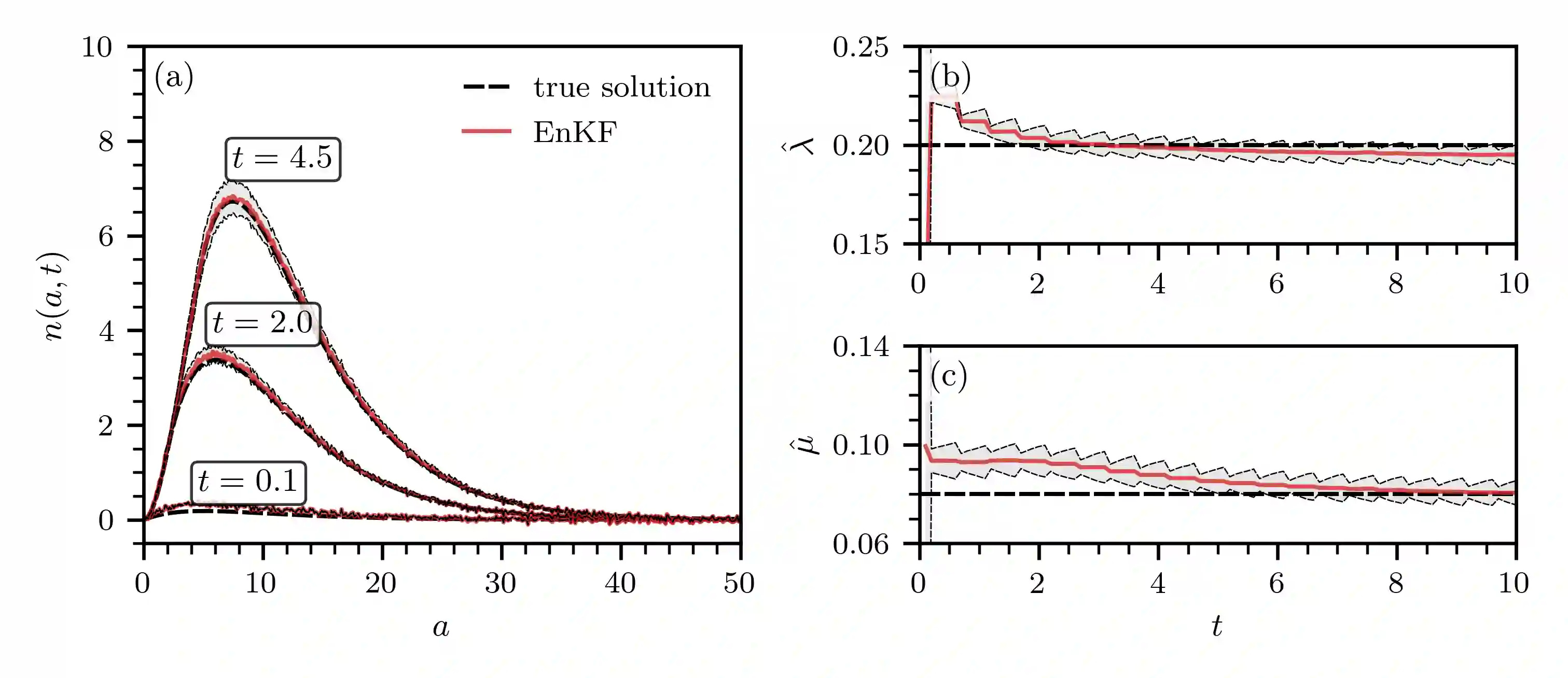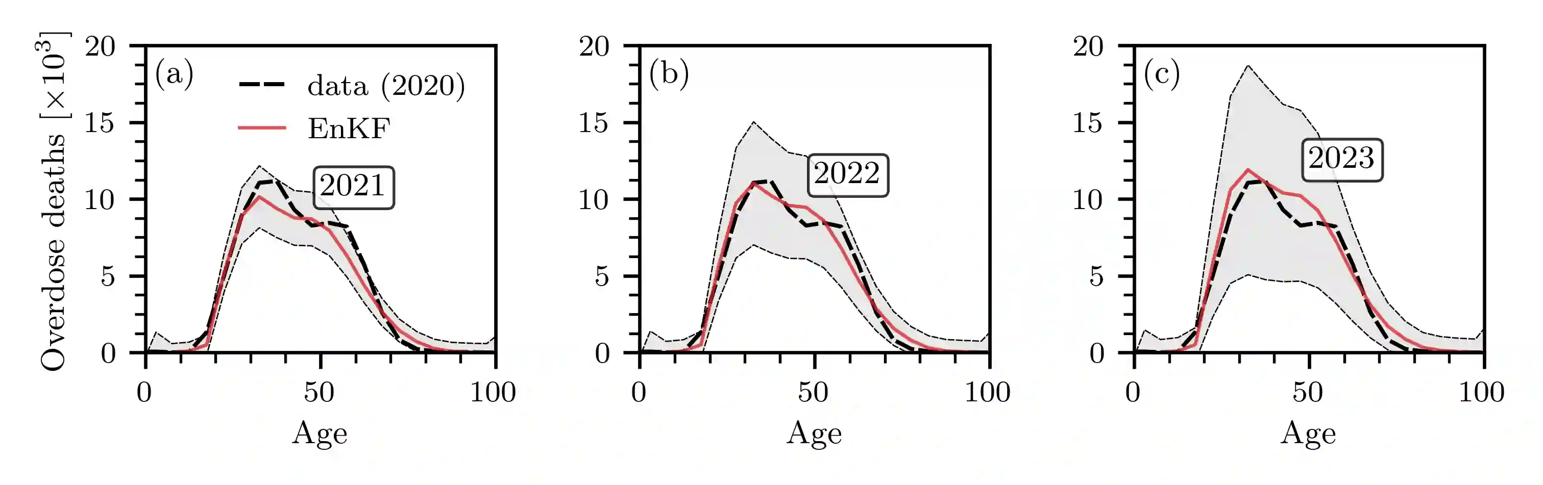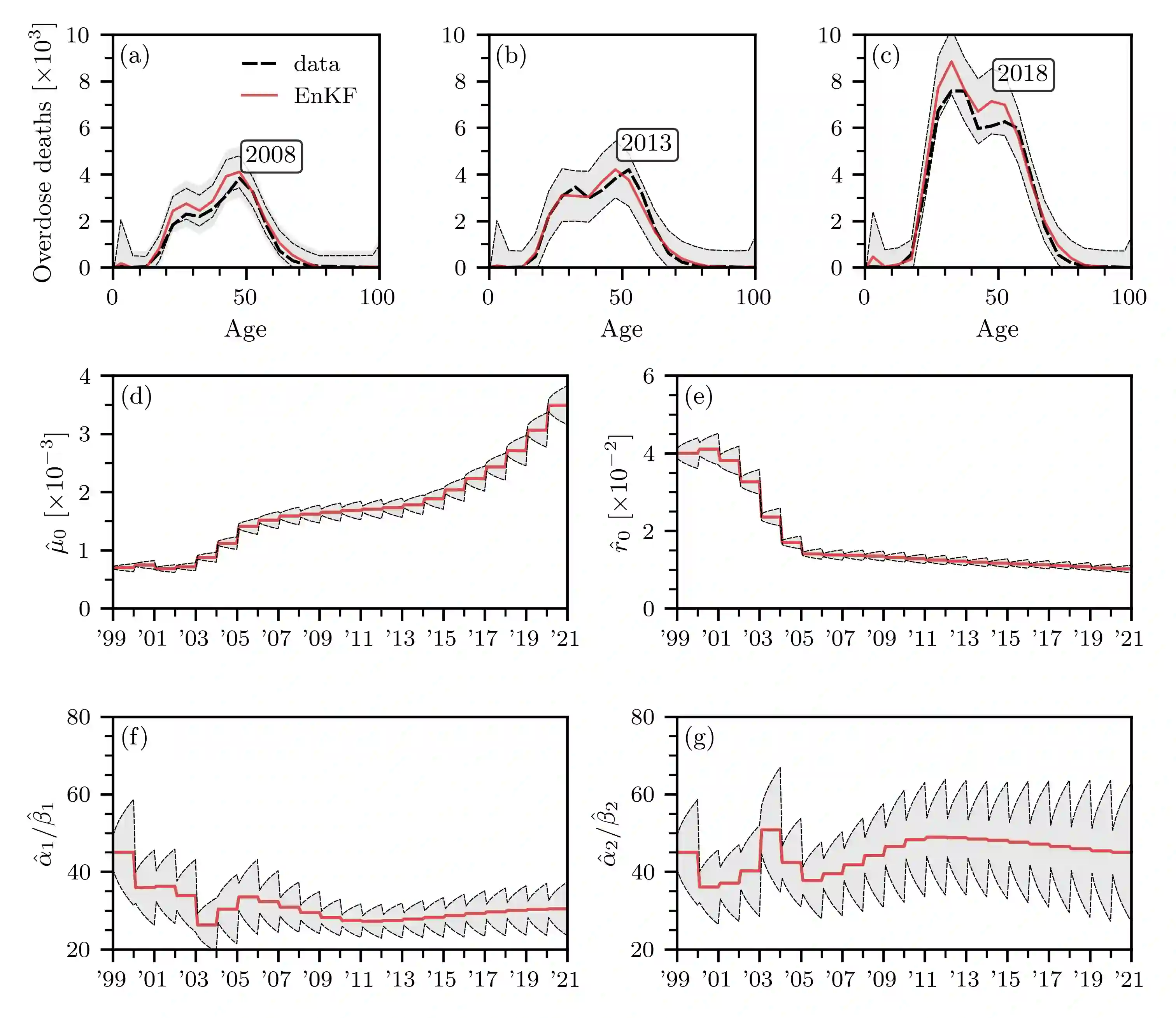 翻译:药物过量死亡在美国所有主要药品类别中继续增加。在过去的20年中,药物过量死亡总数增加了五倍以上;自2013年以来,过量率的激增主要是由芬太尼和甲基苯丙胺驱动的。不同的药品类别和影响药物过量死亡率的因素(如年龄,性别和种族)可能具有不同的特征,并且可能会随着时间而改变。例如,1940年至1990年,药物过量死亡者的平均年龄已经降低,而总体死亡率却稳步增加。为了提供药物成瘾的人群层面的动态,我们开发了一种针对药物成瘾的年龄结构模型。我们使用增广集合卡尔曼滤波器(EnKF)通过一个简单的示例展示了我们的模型如何与合成观测数据相结合,以估计死亡率和年龄分布参数。最后,我们使用EnKF将我们的模型与1999年至2020年美国药物过量死亡的观测数据相结合,预测过量趋势的演变并估计模型参数。