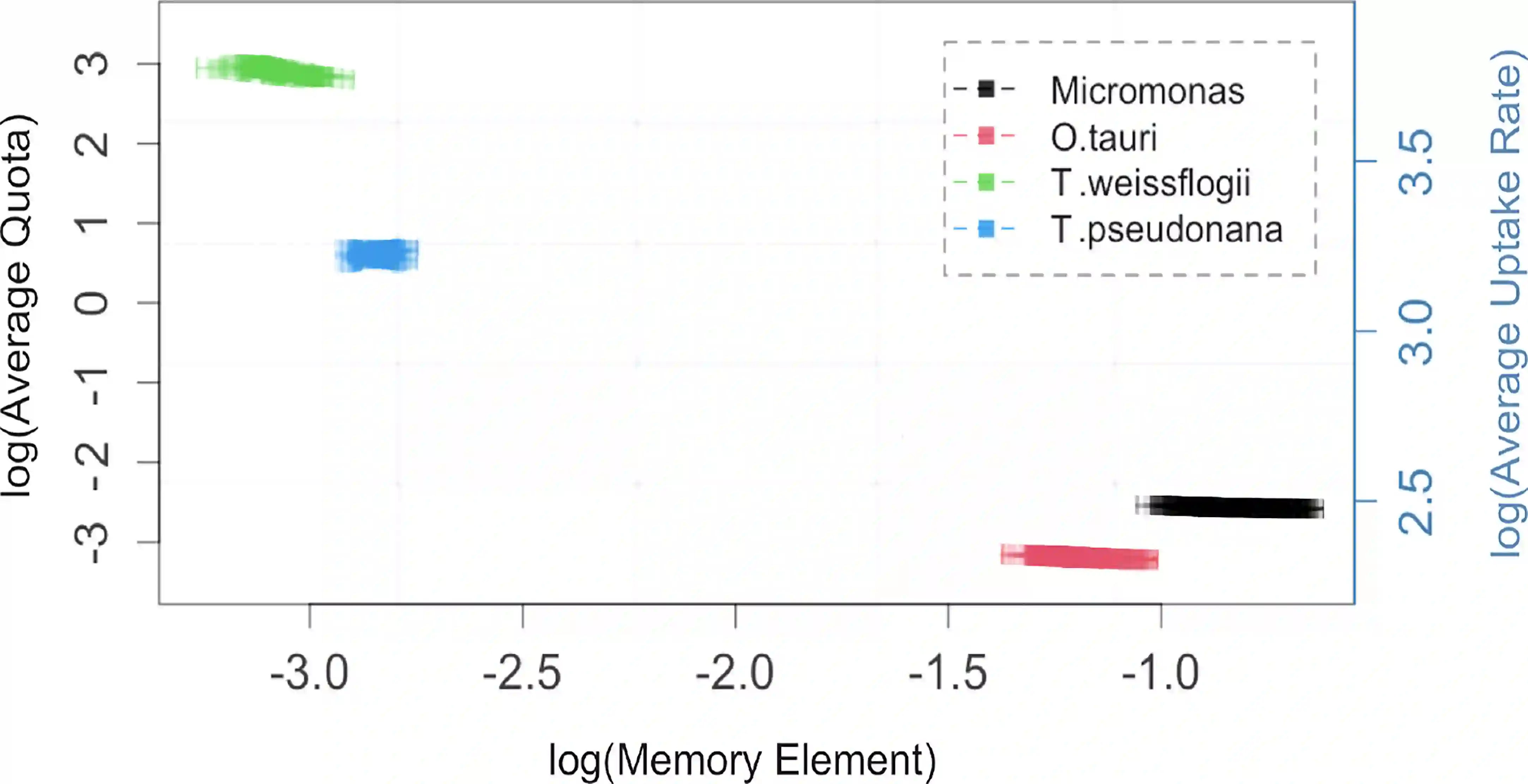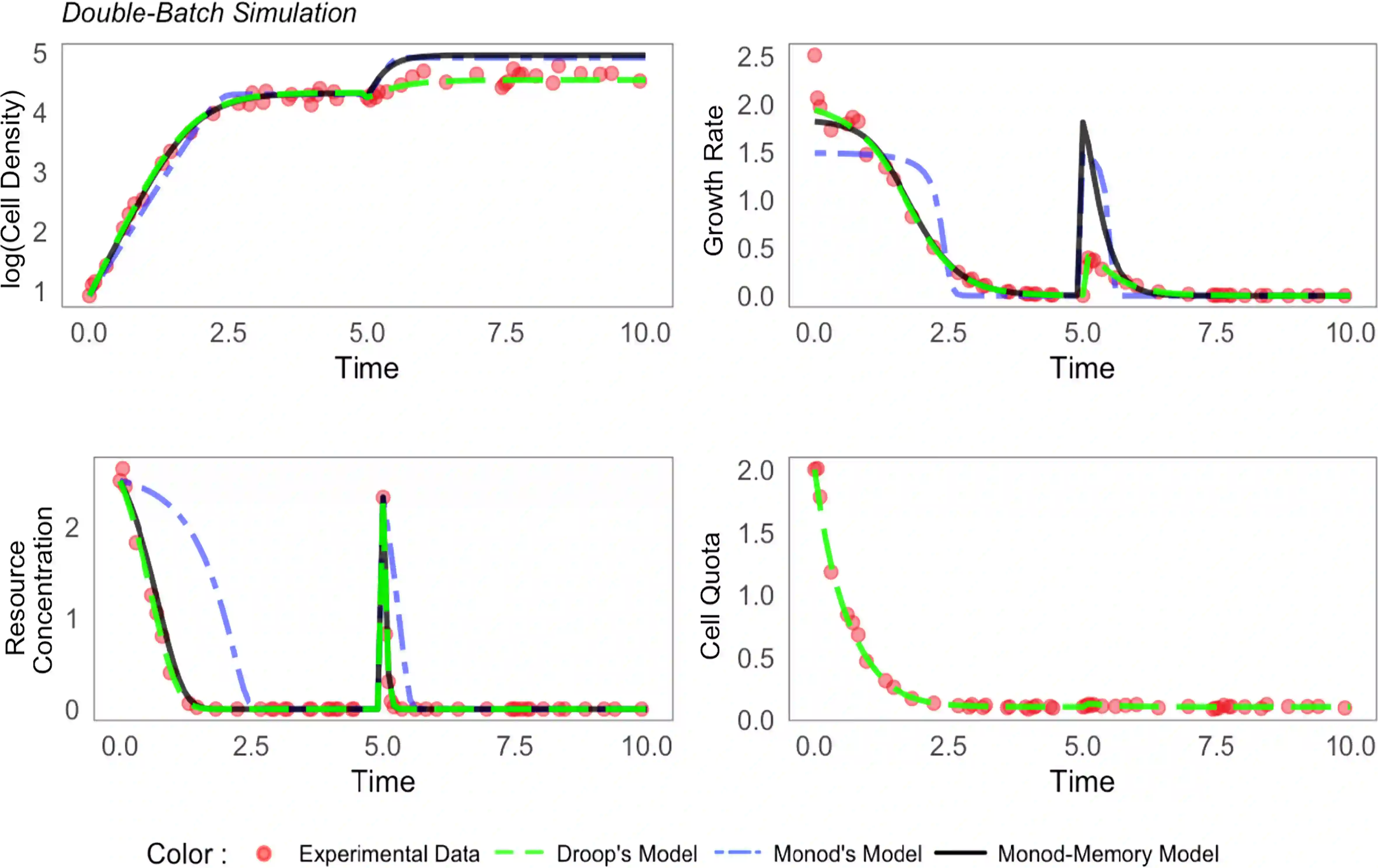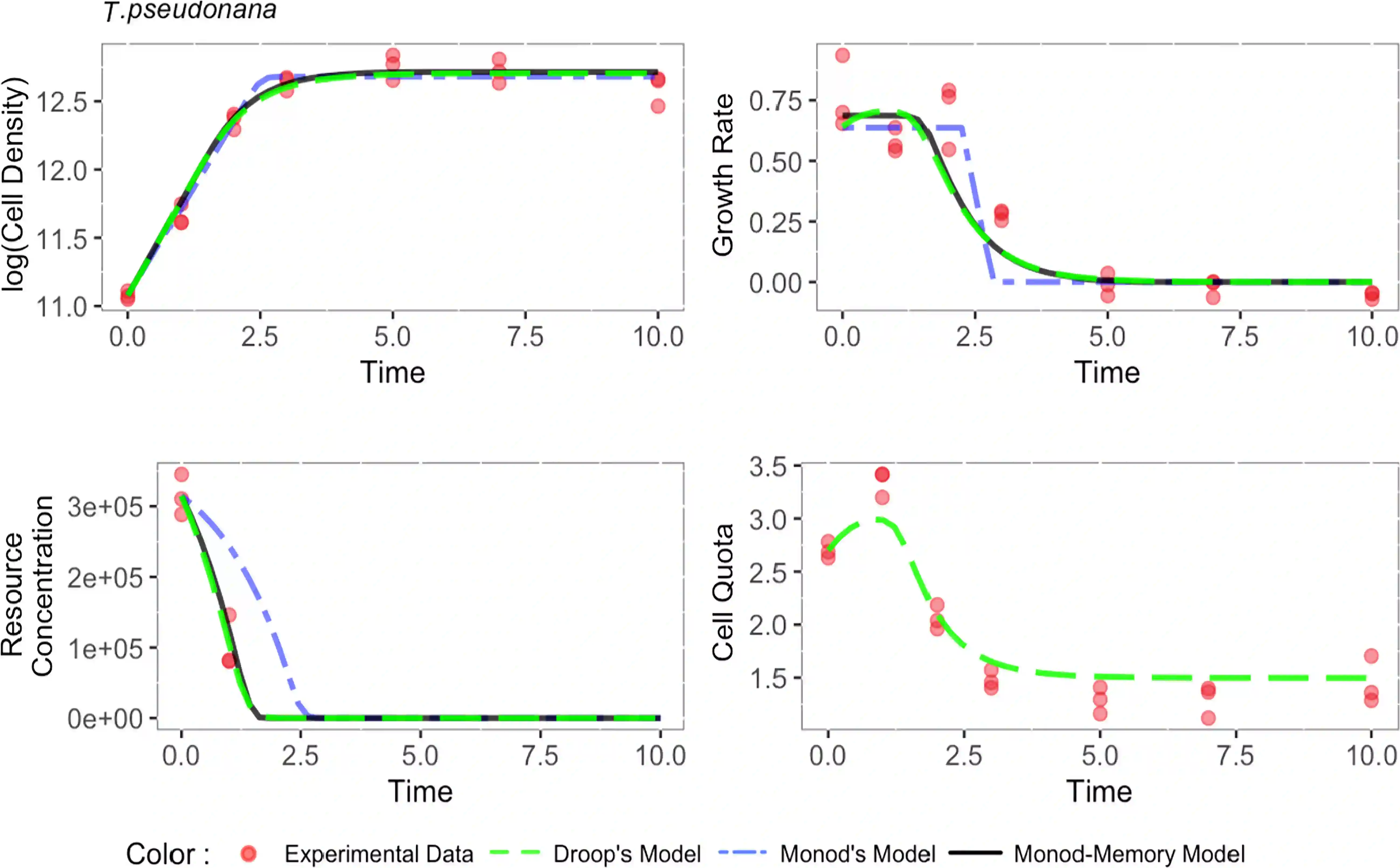 翻译:Monod 模型描述微生物利用细胞外资源浓度的超偏移功能而生长的微生物。 在这种模型与实验数据相比变化不定或有限的资源浓度下,该模型运行不良,它激励着更复杂的Droop模型,并有一个时间变化的内部储存库。我们扩展了单项模型,以包含过去条件的记忆,增加了一个由分微微积分分析驱动的单一参数。我们展示了如何在生物背景下解释记忆元素,并描述其与资源储存库的联系。在非平衡条件下氮饥饿的情况下,我们用模拟和实验性数据来验证该模型,从对地原子(T.伪诺纳和T. Weisflogii)和prasinophytes(Micromonas sp. and O. tauri)的实验室文化中获取的经验数据。我们利用统计分析,显示我们的单项模型估计了生长速率、细胞密度和资源浓度以及Droop 模型,同时要求一个较低的状态变量。我们简单的模型可以改进在低计算成本的复杂地球系统模型中对植物浮游生物动态的描述。