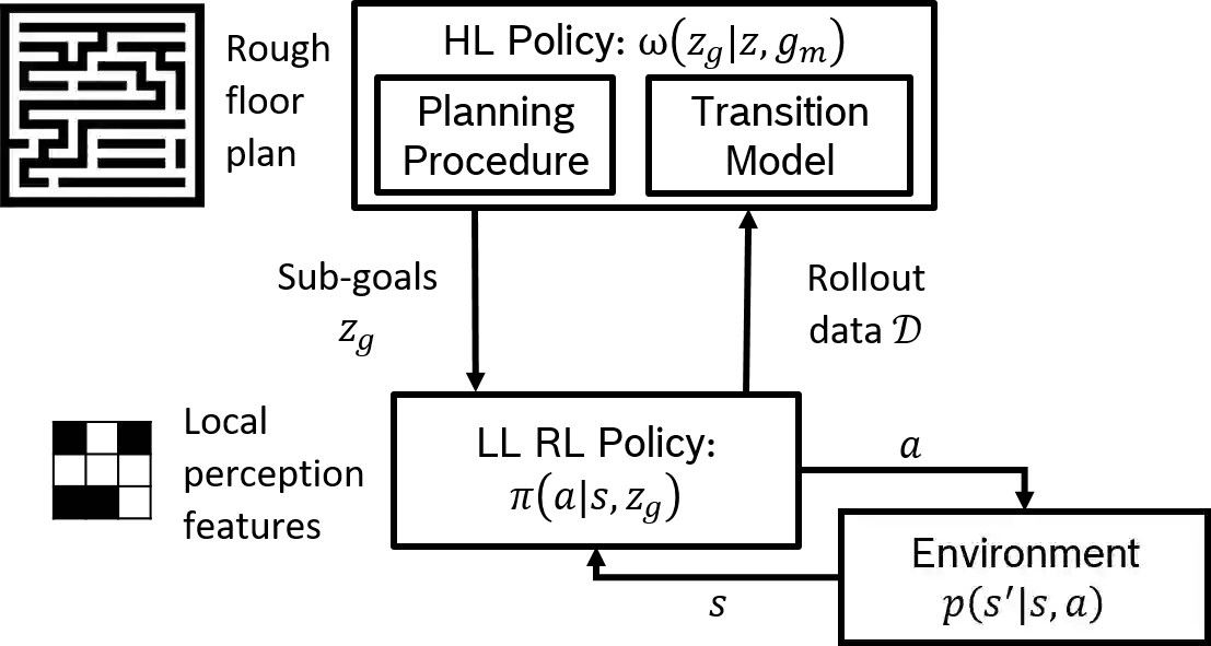 翻译:通过强化学习(RL)解决机器人导航任务具有挑战性,因为其奖赏稀少,而且决策视野长,但是在许多导航任务中,都存在像粗糙的楼层计划那样的高层次(HL)任务说明,但在许多导航任务中,高级别(HL)任务说明,可以像粗略的楼层计划一样,提供高层次(HL)任务说明。以前的工作表明,通过高层次方法,通过高层次(HL)任务说明,通过高层次方法,高效率地学习,包括高层次代表层代表的路径规划,包括高层次代表层代表的路径规划,并使用从计划中得出的次级目标,以指导RL(RL)在源任务中指导RL(RL)政策。然而,这些方法通常忽视机器人在规划期间的复杂动态和次最佳次目标影响能力。这项工作克服了这些局限性,提出了新的等级框架,利用了高层次代表制规划政策。利用收集的推出的数据,可以学习机器人的机器人能力和环境条件。我们具体采用了基于价值迭代价值的规划政策,并采用学习的过渡模式(VI-RL)在模拟机器人导航任务任务任务中,比Vanilla RL(VL)使任务得到明显改进的基线,但没有困难。