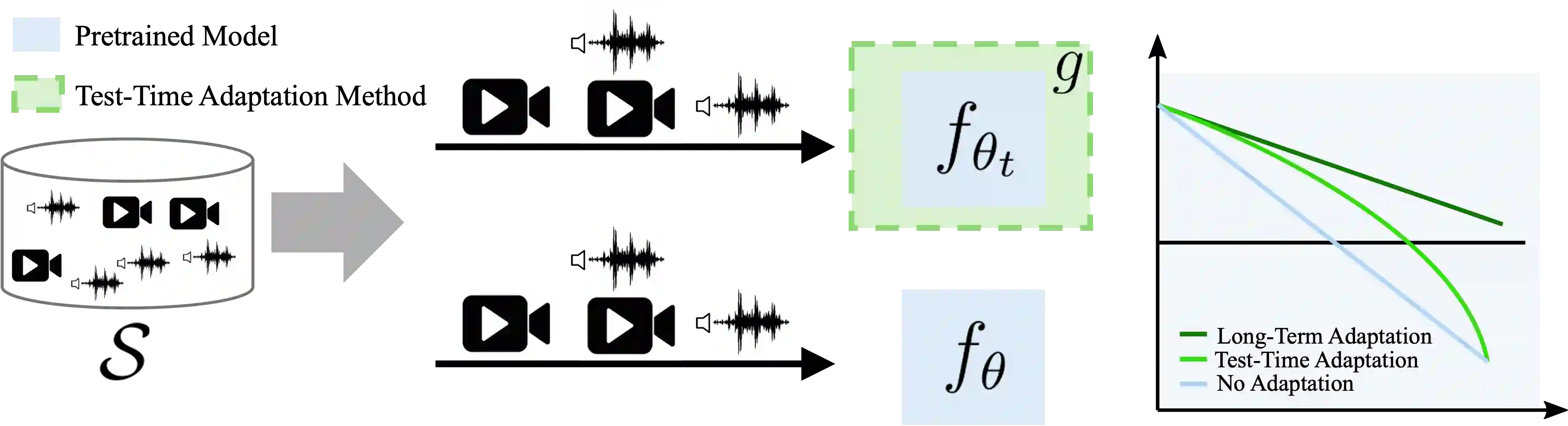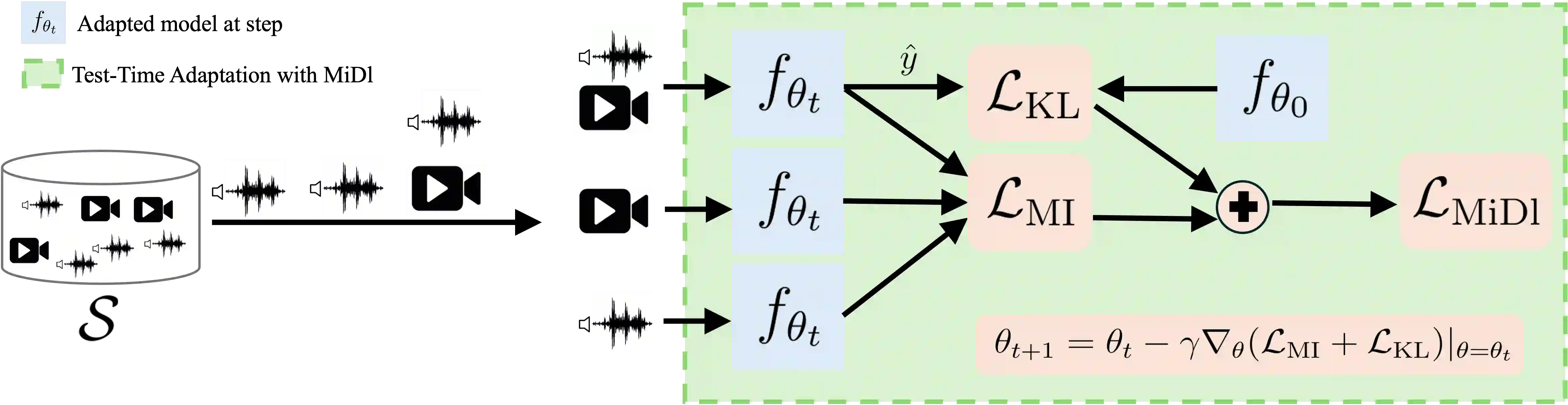 Understanding videos that contain multiple modalities is crucial, especially in egocentric videos, where combining various sensory inputs significantly improves tasks like action recognition and moment localization. However, real-world applications often face challenges with incomplete modalities due to privacy concerns, efficiency needs, or hardware issues. Current methods, while effective, often necessitate retraining the model entirely to handle missing modalities, making them computationally intensive, particularly with large training datasets. In this study, we propose a novel approach to address this issue at test time without requiring retraining. We frame the problem as a test-time adaptation task, where the model adjusts to the available unlabeled data at test time. Our method, MiDl~(Mutual information with self-Distillation), encourages the model to be insensitive to the specific modality source present during testing by minimizing the mutual information between the prediction and the available modality. Additionally, we incorporate self-distillation to maintain the model's original performance when both modalities are available. MiDl represents the first self-supervised, online solution for handling missing modalities exclusively at test time. Through experiments with various pretrained models and datasets, MiDl demonstrates substantial performance improvement without the need for retraining.