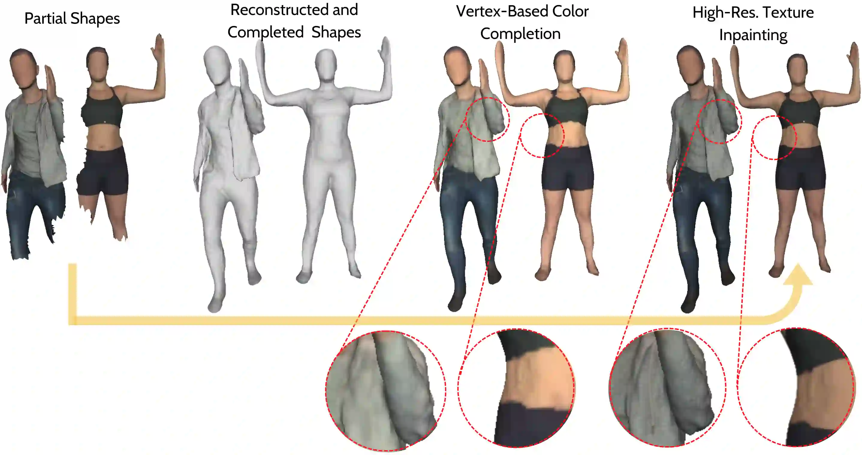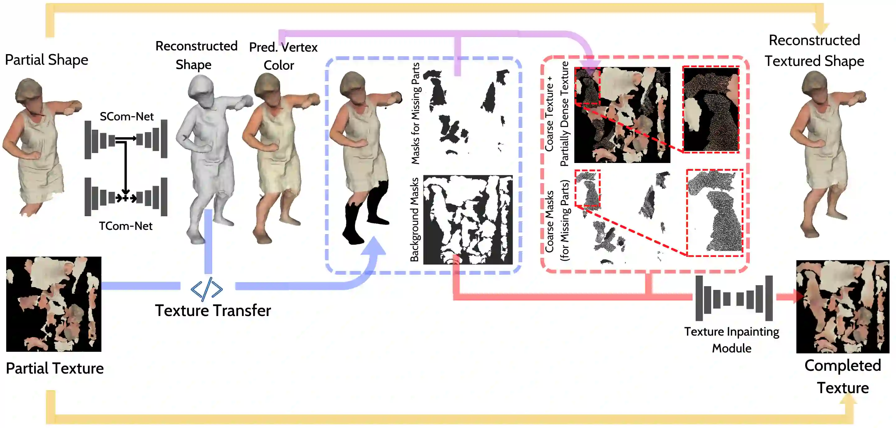 翻译:从 3D 部分纹理扫描 重建 3D 人体形状 从 3D 部分纹理扫描 重建 3D 人体形状仍然是许多计算机视觉和图形应用 -- -- 例如身体动画和虚拟敷料 -- -- 的一项基本任务。我们提议为 3D 身体形状和高分辨率纹理完成 -- -- BCom-Net -- -- 建立一个新的神经网络架构,可以将完整的几何从中层重建到高级部分输入扫描。我们将总体重建任务分为两个阶段 -- -- 首先,一个联合隐含学习网络(SCom-Net 和 TCom-Net Net), 将一个氧化扫描及其占用网作为重建整个身体形状和预测螺旋纹理的投入。第二,一个高分辨率纹理完成网络,利用预测的神经垂直纹理纹理纹理将部分“ Textlas” 的缺失部分重新粉饰。一个关于 3DbodyTex.V2 数据集的索罗夫实验性评价显示,我们的方法在状态上取得了竞争性的结果,同时将一般地归纳为不同类型和部分形状的层次。提议的方法也在SHAR1 20RF 中排名中排名 。