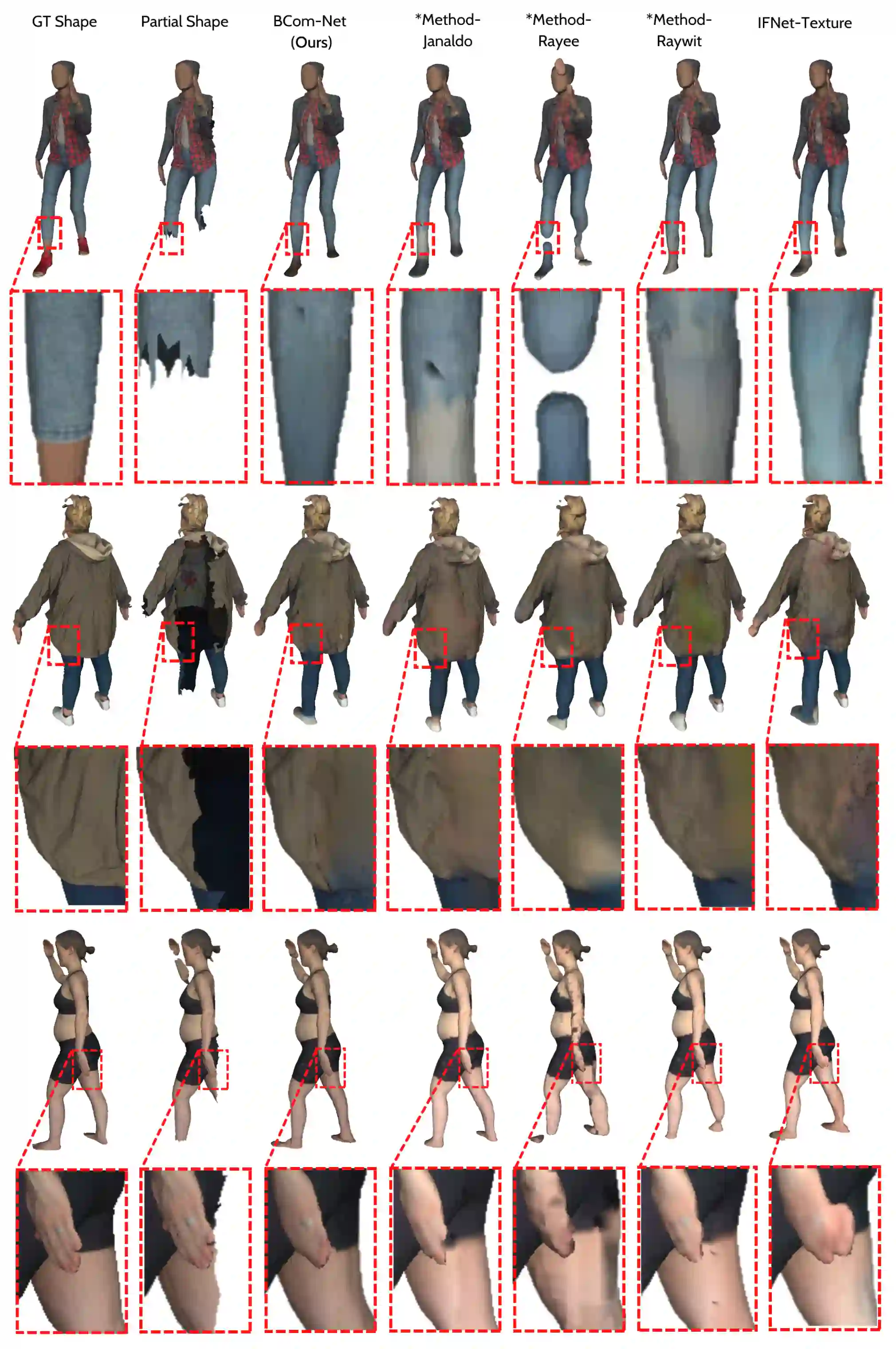 Reconstructing 3D human body shapes from 3D partial textured scans remains a fundamental task for many computer vision and graphics applications -- e.g., body animation, and virtual dressing. We propose a new neural network architecture for 3D body shape and high-resolution texture completion -- BCom-Net -- that can reconstruct the full geometry from mid-level to high-level partial input scans. We decompose the overall reconstruction task into two stages - first, a joint implicit learning network (SCom-Net and TCom-Net) that takes a voxelized scan and its occupancy grid as input to reconstruct the full body shape and predict vertex textures. Second, a high-resolution texture completion network, that utilizes the predicted coarse vertex textures to inpaint the missing parts of the partial 'texture atlas'. A Thorough experimental evaluation on 3DBodyTex.V2 dataset shows that our method achieves competitive results with respect to the state-of-the-art while generalizing to different types and levels of partial shapes. The proposed method has also ranked second in the SHARP 2022 Challenge1-Track1.