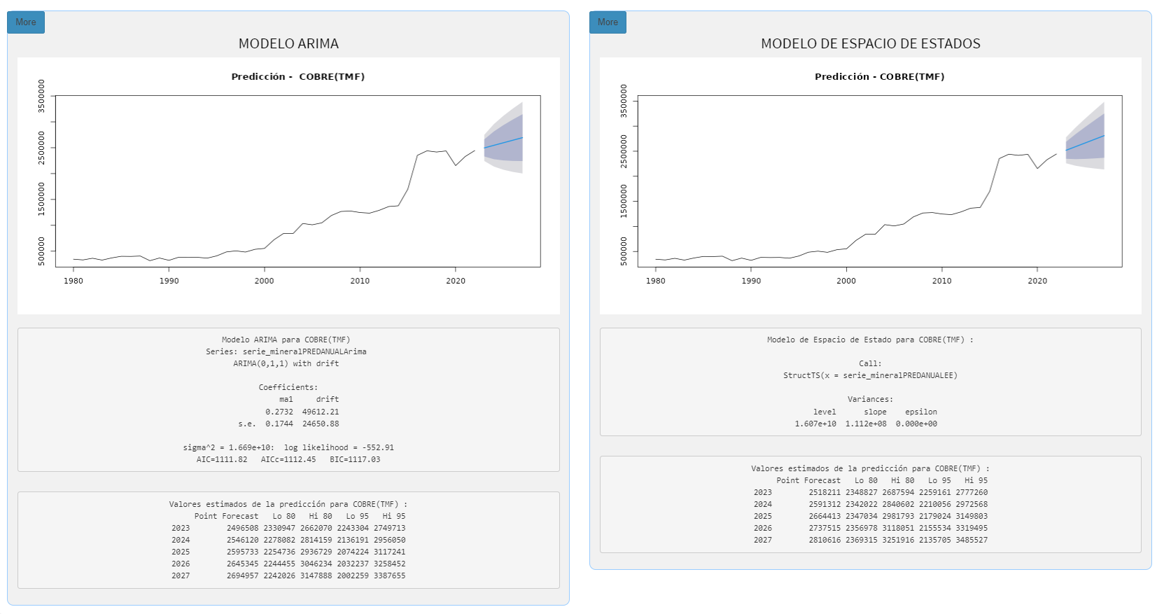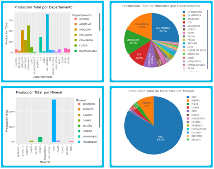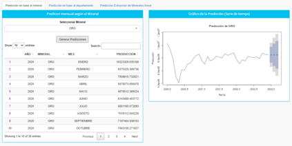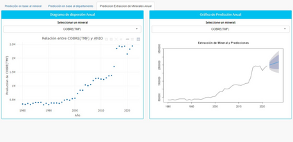 Peruvian mining plays a crucial role in the country's economy, being one of the main producers and exporters of minerals worldwide. In this project, an application was developed in RStudio that utilizes statistical analysis and time series modeling techniques to understand and forecast mineral extraction in different departments of Peru. The application includes an interactive map that allows users to explore Peruvian geography and obtain detailed statistics by clicking on each department. Additionally, bar charts, pie charts, and frequency polygons were implemented to visualize and analyze the data. Using the ARIMA model, predictions were made on the future extraction of minerals, enabling informed decision-making in planning and resource management within the mining sector. The application provides an interactive and accessible tool to explore the Peruvian mining industry, comprehend trends, and make accurate forecasts. These predictions for 2027 in total annual production are as follows: Copper = 2,694,957 MT, Gold = 72,817.47 kg Fine, Zinc = 1,369,649 MT, Silver = 3,083,036 MT, Lead = 255,443 MT, Iron = 15,776,609 MT, Tin = 29,542 MT, Molybdenum = 35,044.66 MT, and Cadmium = 724 MT. These predictions, based on historical data, provide valuable information for strategic decision-making and contribute to the sustainable development of the mining industry in Peru.