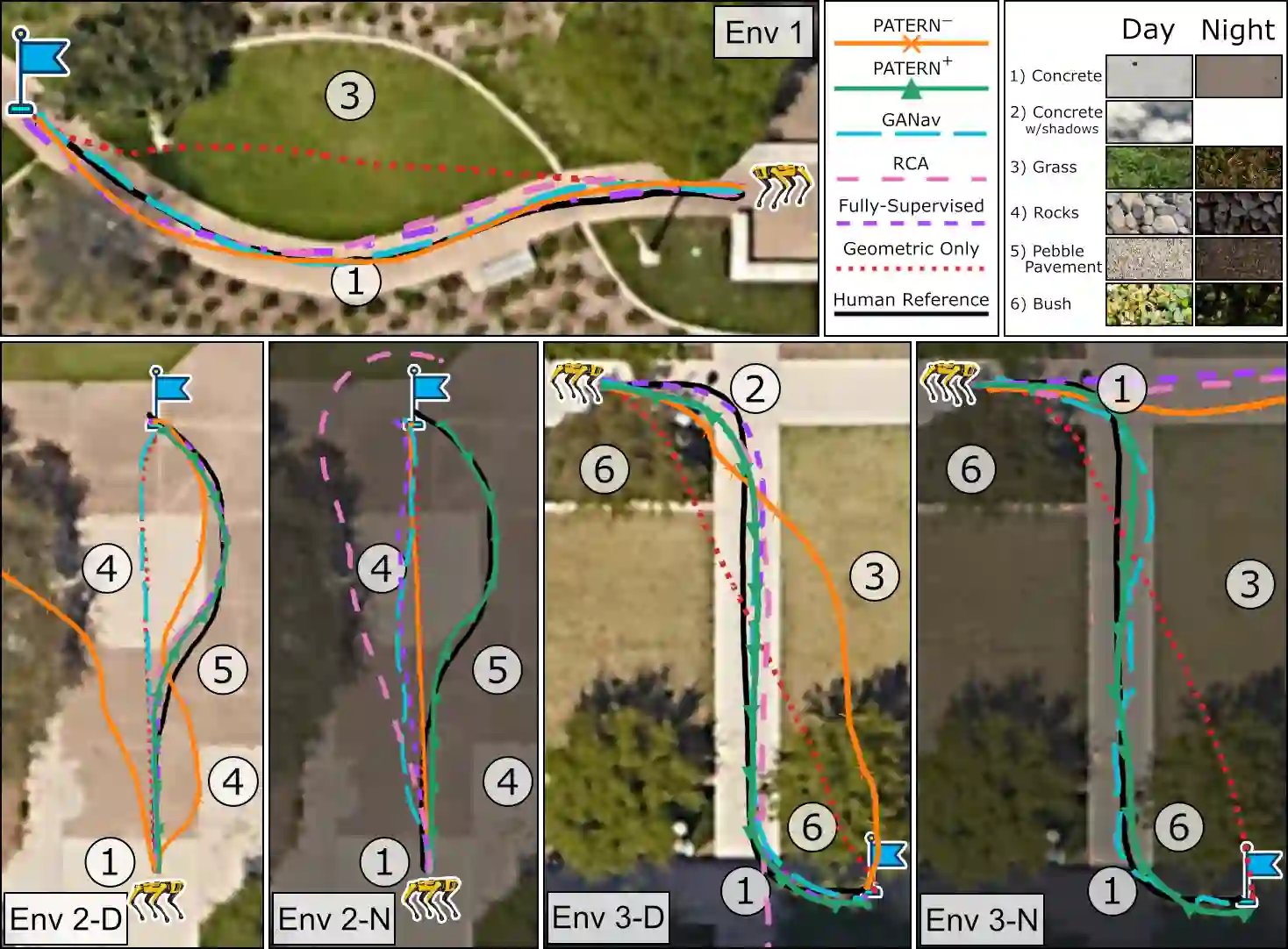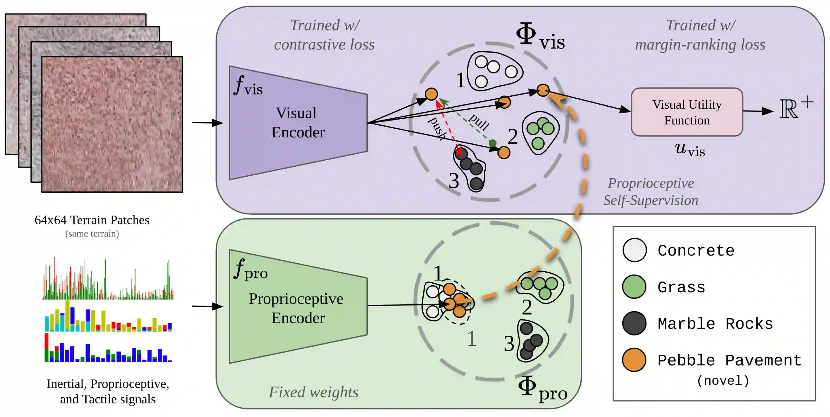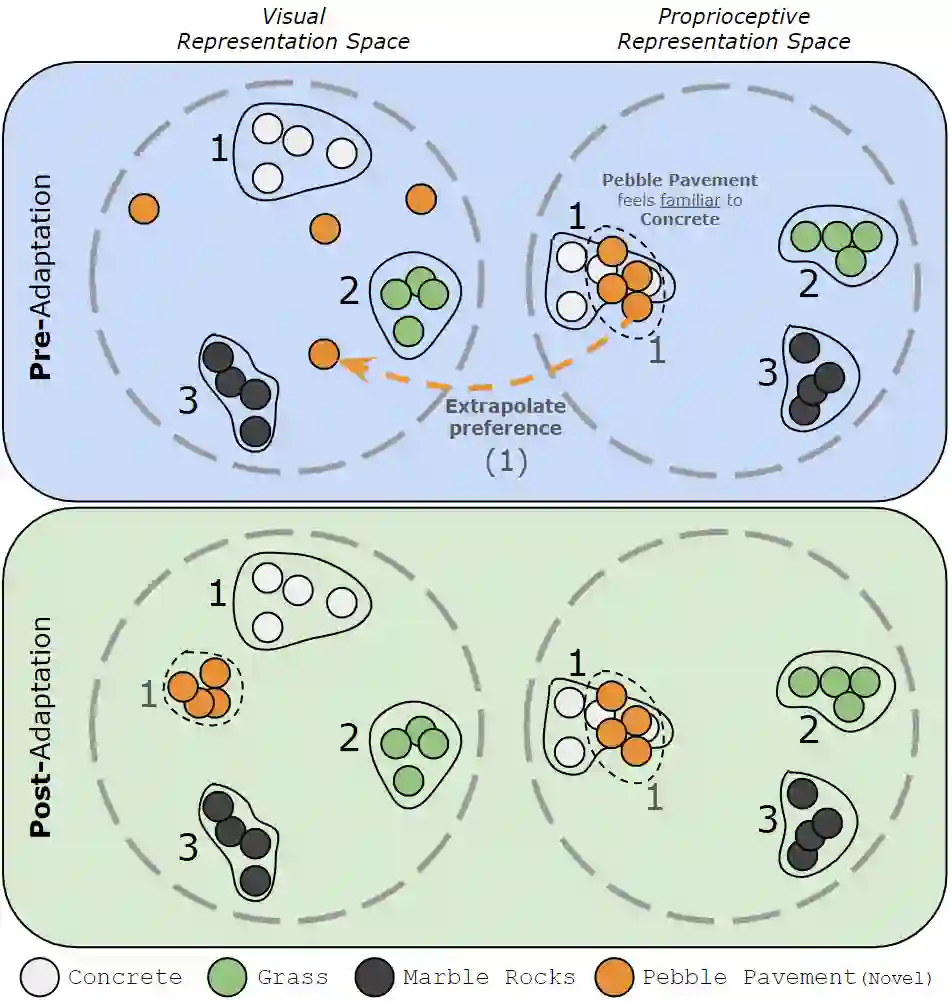 Autonomous mobility tasks such as lastmile delivery require reasoning about operator indicated preferences over terrains on which the robot should navigate to ensure both robot safety and mission success. However, coping with out of distribution data from novel terrains or appearance changes due to lighting variations remains a fundamental problem in visual terrain adaptive navigation. Existing solutions either require labor intensive manual data recollection and labeling or use handcoded reward functions that may not align with operator preferences. In this work, we posit that operator preferences for visually novel terrains, which the robot should adhere to, can often be extrapolated from established terrain references within the inertial, proprioceptive, and tactile domain. Leveraging this insight, we introduce Preference extrApolation for Terrain awarE Robot Navigation, PATERN, a novel framework for extrapolating operator terrain preferences for visual navigation. PATERN learns to map inertial, proprioceptive, tactile measurements from the robots observations to a representation space and performs nearest neighbor search in this space to estimate operator preferences over novel terrains. Through physical robot experiments in outdoor environments, we assess PATERNs capability to extrapolate preferences and generalize to novel terrains and challenging lighting conditions. Compared to baseline approaches, our findings indicate that PATERN robustly generalizes to diverse terrains and varied lighting conditions, while navigating in a preference aligned manner.