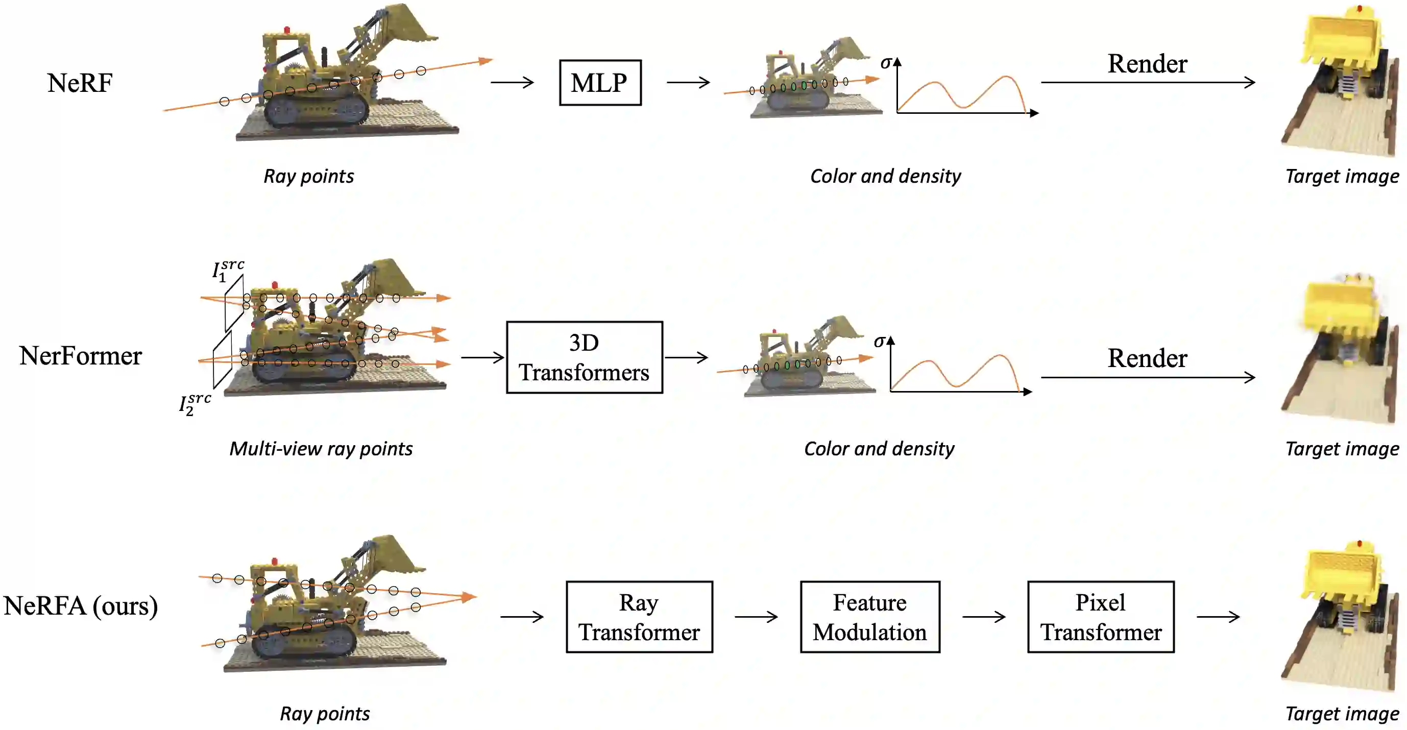 翻译:在本文中, 我们展示了一个简单的后继2seq 配方, 用于查看合成。 我们将一组射线点作为与射线相对应的输入和输出颜色。 直接将一个标准变压器用于此后继2seq 配方有两个限制。 首先, 标准关注无法成功地适应体积转换程序, 因此在综合观点中缺少高频组件。 其次, 对所有射线和像素应用全球关注极为低效。 在神经光亮场的启发下, 我们建议 NERFA 关注( NERFA ) 解决上述问题。 一方面, NERFA 将体积转换方程式视为软功能调制程序。 这样, 功能调制能增强变压器, 与NERFS一样的演算偏差。 另一方面, NERFA 将多阶段关注减少计算管理。 此外, NERFA 模型采用射线和像变压器来学习射线和像素之间的相互作用。 NERFA 将展示优优于NRF和 NerferF3 的图像, 在四种公开的版本中, 设置下, 。 将建立一个新的 Creal- Forformax- 。 。 。 在四个 设置下, 建立新的 建立新的 Cal- gold- gold- 。