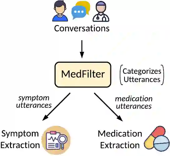 Information extraction from conversational data is particularly challenging because the task-centric nature of conversation allows for effective communication of implicit information by humans, but is challenging for machines. The challenges may differ between utterances depending on the role of the speaker within the conversation, especially when relevant expertise is distributed asymmetrically across roles. Further, the challenges may also increase over the conversation as more shared context is built up through information communicated implicitly earlier in the dialogue. In this paper, we propose the novel modeling approach MedFilter, which addresses these insights in order to increase performance at identifying and categorizing task-relevant utterances, and in so doing, positively impacts performance at a downstream information extraction task. We evaluate this approach on a corpus of nearly 7,000 doctor-patient conversations where MedFilter is used to identify medically relevant contributions to the discussion (achieving a 10% improvement over SOTA baselines in terms of area under the PR curve). Identifying task-relevant utterances benefits downstream medical processing, achieving improvements of 15%, 105%, and 23% respectively for the extraction of symptoms, medications, and complaints.