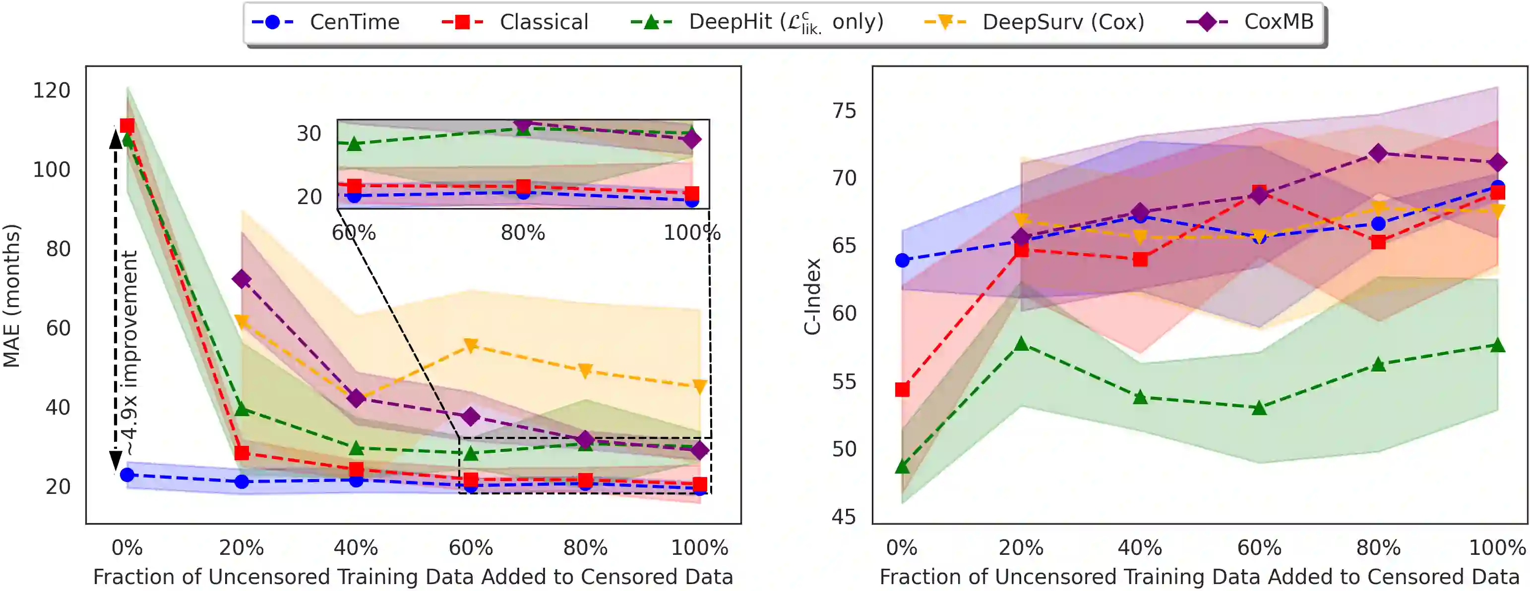 Survival analysis is a valuable tool for estimating the time until specific events, such as death or cancer recurrence, based on baseline observations. This is particularly useful in healthcare to prognostically predict clinically important events based on patient data. However, existing approaches often have limitations; some focus only on ranking patients by survivability, neglecting to estimate the actual event time, while others treat the problem as a classification task, ignoring the inherent time-ordered structure of the events. Furthermore, the effective utilization of censored samples - training data points where the exact event time is unknown - is essential for improving the predictive accuracy of the model. In this paper, we introduce CenTime, a novel approach to survival analysis that directly estimates the time to event. Our method features an innovative event-conditional censoring mechanism that performs robustly even when uncensored data is scarce. We demonstrate that our approach forms a consistent estimator for the event model parameters, even in the absence of uncensored data. Furthermore, CenTime is easily integrated with deep learning models with no restrictions on batch size or the number of uncensored samples. We compare our approach with standard survival analysis methods, including the Cox proportional-hazard model and DeepHit. Our results indicate that CenTime offers state-of-the-art performance in predicting time-to-death while maintaining comparable ranking performance. Our implementation is publicly available at https://github.com/ahmedhshahin/CenTime.