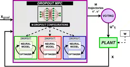 Neural networks are lately more and more often being used in the context of data-driven control, as an approximate model of the true system dynamics. Model Predictive Control (MPC) adopts this practise leading to neural MPC strategies. This raises a question of whether the trained neural network has converged and generalized in a way that the learned model encapsulates an accurate approximation of the true dynamic model of the system, thus making it a reliable choice for model-based control, especially for disturbed and uncertain systems. To tackle that, we propose Dropout MPC, a novel sampling-based ensemble neural MPC algorithm that employs the Monte-Carlo dropout technique on the learned system model. The closed loop is based on an ensemble of predictive controllers, that are used simultaneously at each time-step for trajectory optimization. Each member of the ensemble influences the control input, based on a weighted voting scheme, thus by employing different realizations of the learned system dynamics, neural control becomes more reliable by design. An additional strength of the method is that it offers by design a way to estimate future uncertainty, leading to cautious control. While the method aims in general at uncertain systems with complex dynamics, where models derived from first principles are hard to infer, to showcase the application we utilize data gathered in the laboratory from a real mobile manipulator and employ the proposed algorithm for the navigation of the robot in simulation.