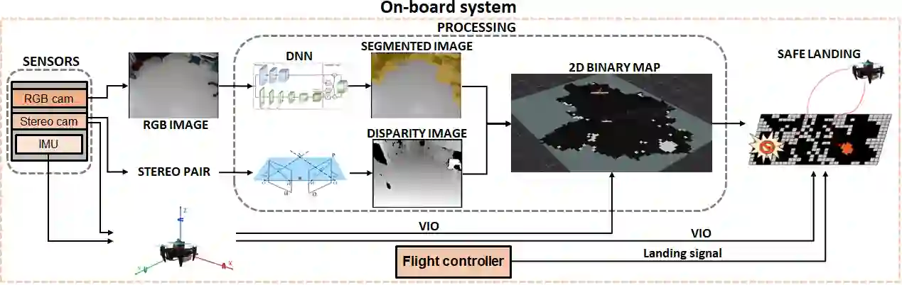 Autonomous identification and evaluation of safe landing zones are of paramount importance for ensuring the safety and effectiveness of aerial robots in the event of system failures, low battery, or the successful completion of specific tasks. In this paper, we present a novel approach for detection and assessment of potential landing sites for safe quadrotor landing. Our solution efficiently integrates 2D and 3D environmental information, eliminating the need for external aids such as GPS and computationally intensive elevation maps. The proposed pipeline combines semantic data derived from a Neural Network (NN), to extract environmental features, with geometric data obtained from a disparity map, to extract critical geometric attributes such as slope, flatness, and roughness. We define several cost metrics based on these attributes to evaluate safety, stability, and suitability of regions in the environments and identify the most suitable landing area. Our approach runs in real-time on quadrotors equipped with limited computational capabilities. Experimental results conducted in diverse environments demonstrate that the proposed method can effectively assess and identify suitable landing areas, enabling the safe and autonomous landing of a quadrotor.