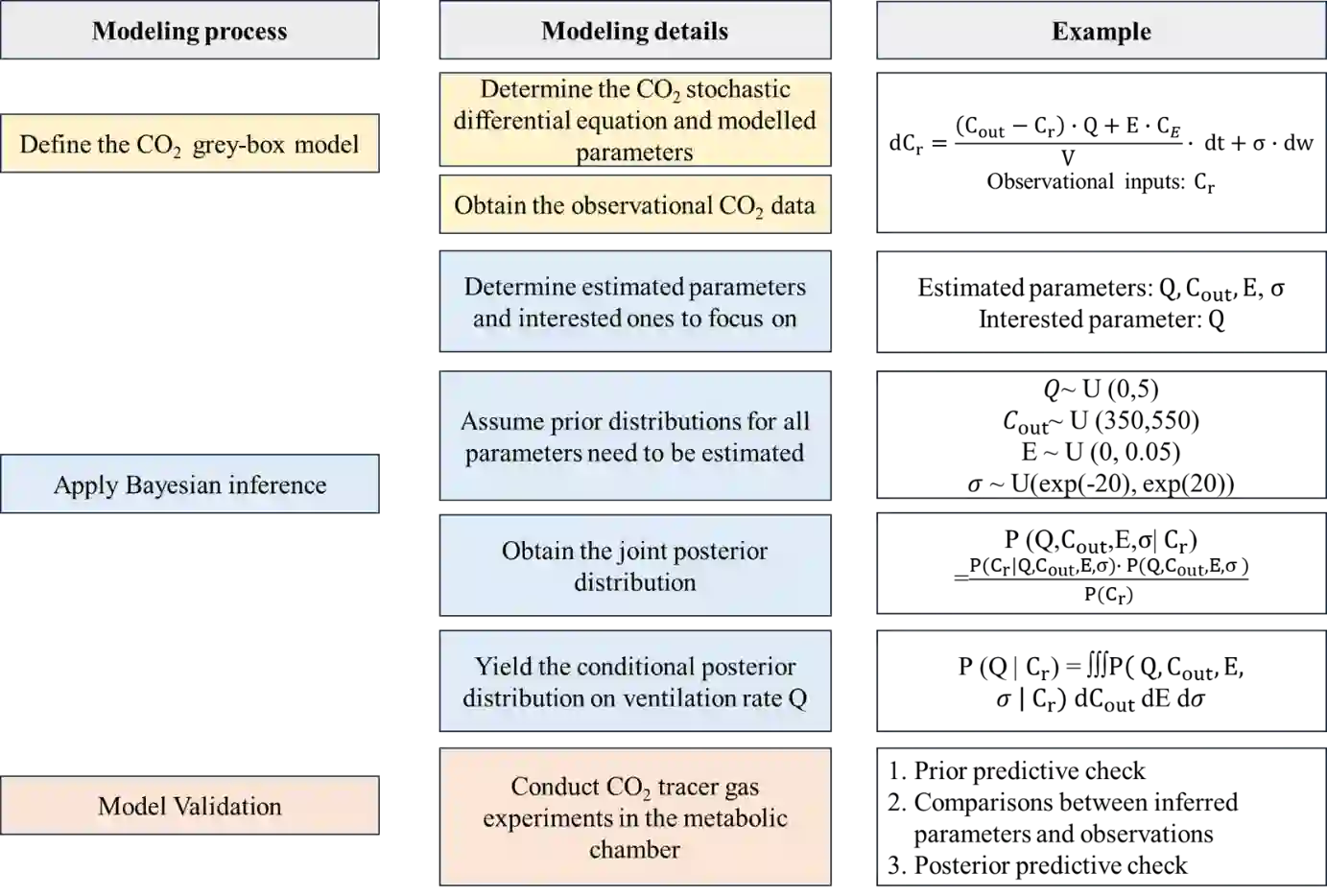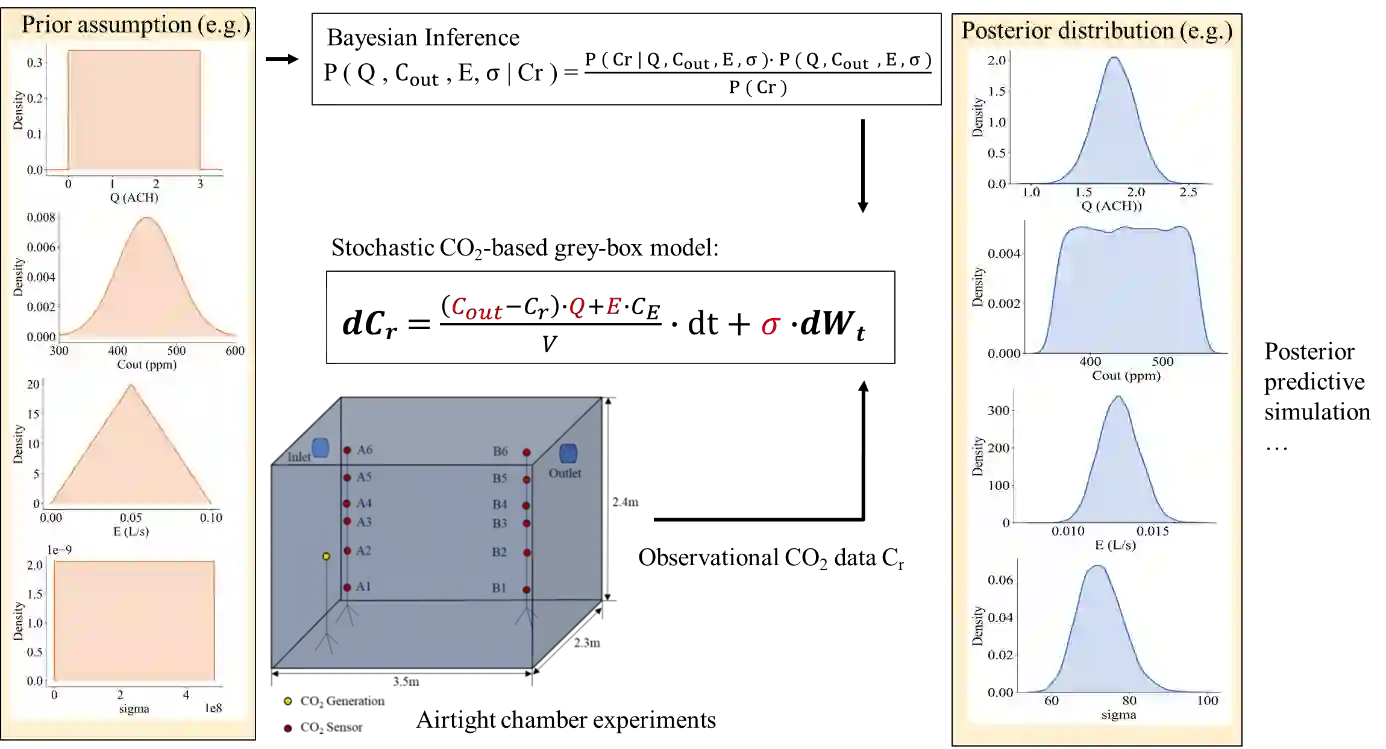 The COVID-19 pandemic brought global attention to indoor air quality (IAQ), which is intrinsically linked to clean air change rates. Estimating the air change rate in indoor environments, however, remains challenging. It is primarily due to the uncertainties associated with the air change rate estimation, such as pollutant generation rates, dynamics including weather and occupancies, and the limitations of deterministic approaches to accommodate these factors. In this study, Bayesian inference was implemented on a stochastic CO2-based grey-box model to infer modeled parameters and quantify uncertainties. The accuracy and robustness of the ventilation rate and CO2 emission rate estimated by the model were confirmed with CO2 tracer gas experiments conducted in an airtight chamber. Both prior and posterior predictive checks (PPC) were performed to demonstrate the advantage of this approach. In addition, uncertainties in real-life contexts were quantified with an incremental variance {\sigma} for the Wiener process. This approach was later applied to evaluate the ventilation conditions within two primary school classrooms in Montreal. The Equivalent Clean Airflow Rate (ECAi) was calculated following ASHRAE 241, and an insufficient clean air supply within both classrooms was identified. A supplement of 800 cfm clear air delivery rate (CADR) from air-cleaning devices is recommended for a sufficient ECAi. Finally, steady-state CO2 thresholds (Climit, Ctarget, and Cideal) were carried out to indicate when ECAi requirements could be achieved under various mitigation strategies, such as portable air cleaners and in-room ultraviolet light, with CADR values ranging from 200 to 1000 cfm.