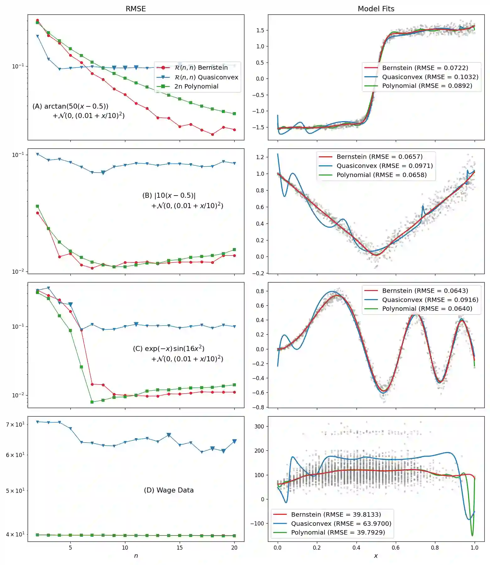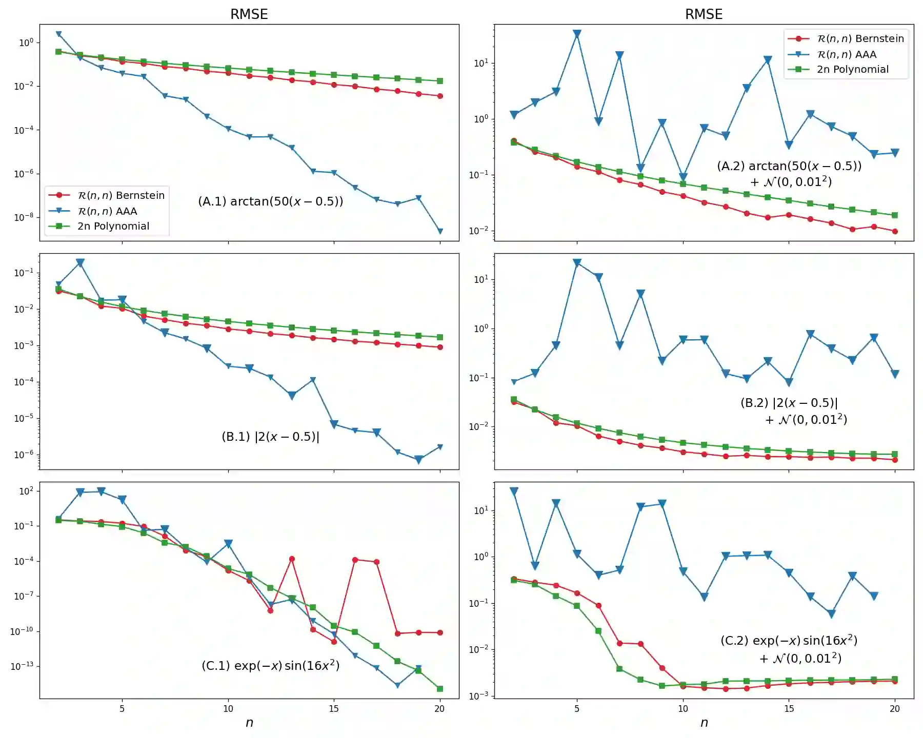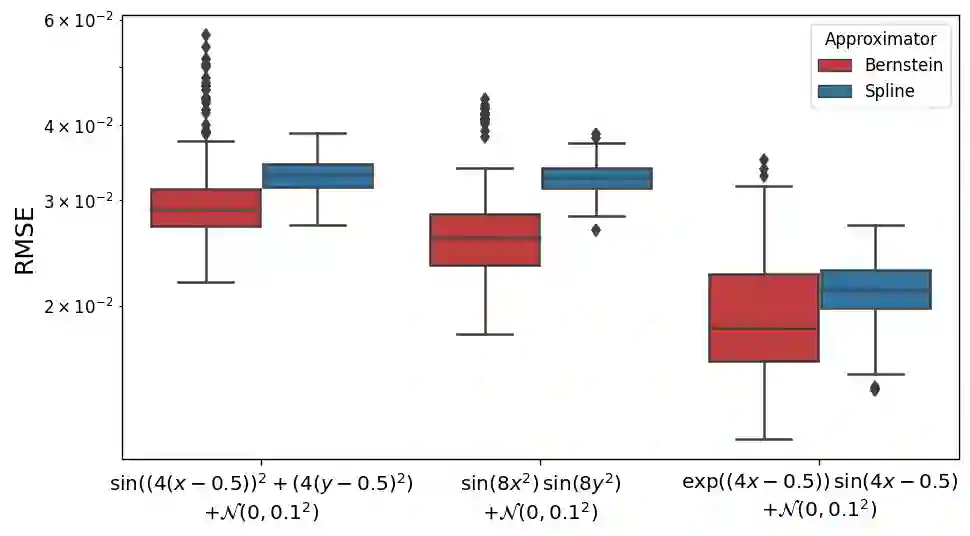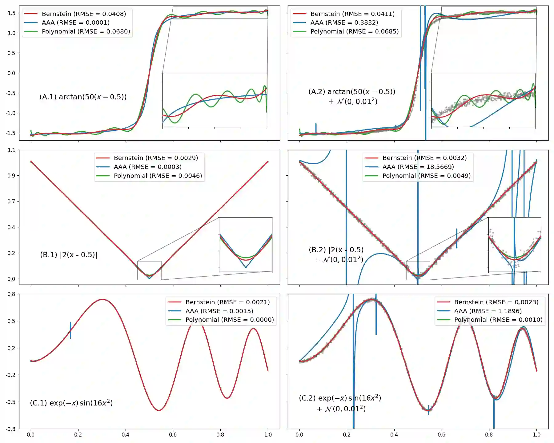 Rational function approximations provide a simple but flexible alternative to polynomial approximation, allowing one to capture complex non-linearities without oscillatory artifacts. However, there have been few attempts to use rational functions on noisy data due to the likelihood of creating spurious singularities. To avoid the creation of singularities, we use Bernstein polynomials and appropriate conditions on their coefficients to force the denominator to be strictly positive. While this reduces the range of rational polynomials that can be expressed, it keeps all the benefits of rational functions while maintaining the robustness of polynomial approximation in noisy data scenarios. Our numerical experiments on noisy data show that existing rational approximation methods continually produce spurious poles inside the approximation domain. This contrasts our method, which cannot create poles in the approximation domain and provides better fits than a polynomial approximation and even penalized splines on functions with multiple variables. Moreover, guaranteeing pole-free in an interval is critical for estimating non-constant coefficients when numerically solving differential equations using spectral methods. This provides a compact representation of the original differential equation, allowing numeric solvers to achieve high accuracy quickly, as seen in our experiments.