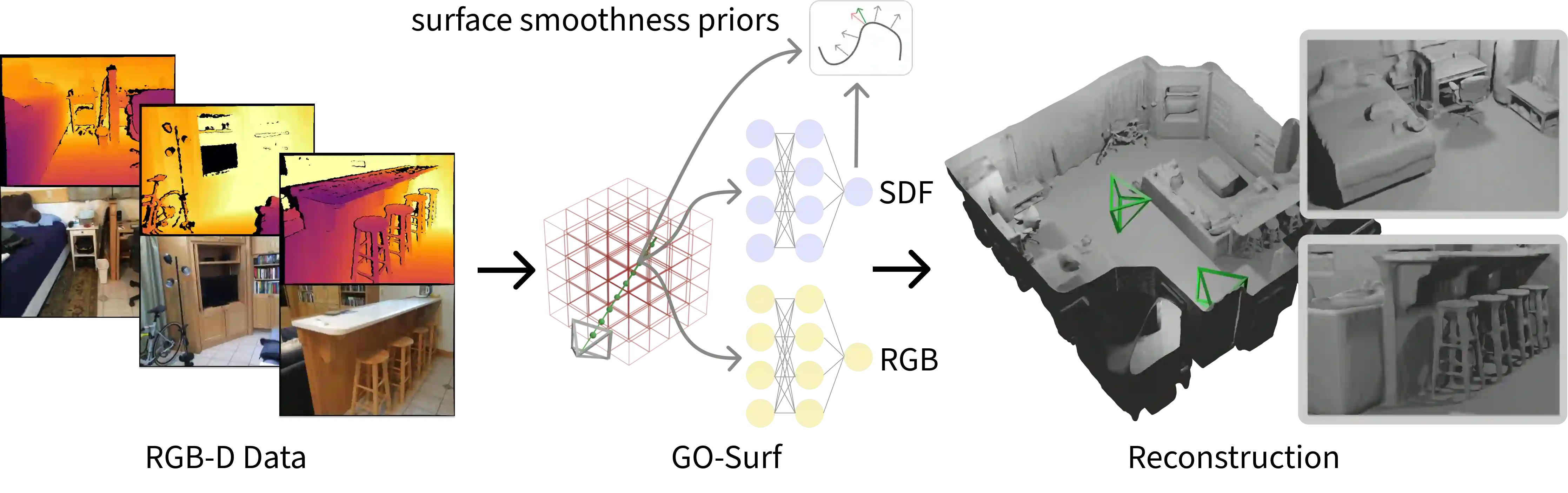 翻译:GO-Surf是使用RGB-D序列进行准确和快速地表重建的直接地格优化方法,我们从RGB-D序列中推出一种直接的地格优化方法,即GO-Surf。我们用一个包含多层次几何和外观信息的高级性格Voxel网格来模拟基础场景,其特性直接优化,这样,在三线内插后,由两个浅色MLP解码,以签署距离和亮度值,通过表面体积转换,使合成和观测RGB/深度值之间的差异最小化。我们的监督信号 -- -- RGB、深度和近似SDF -- -- 可以直接从输入图像中获取,而无需进行聚合或后处理。我们制定了一个新的SDF梯度定式术语,鼓励表面平滑和填补,同时保持高频细节。GO-Surf可以优化1美元-2K框架的顺序,以1美元至45分钟,加速度60美元超过NeurorRGBB-D,这是以MLP代表为基础的最相关方法,同时保持标准基准业绩。项目网页:http://jwangwangin_gusio.giubsurio/gisofgiofgio。