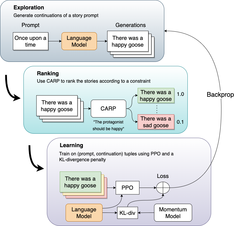翻译:现有的故事偏好控制方法使用迅速的工程,这种工程是劳力密集的,而且往往不一致。它们还可能使用逻辑管理方法,这种方法要求存在附加注释的数据集,以达到理想的属性。为了解决这些问题,我们首先培训一个对比的双相码模型,以便将故事与相应的人类评论、名为CARP的CARP的人类评论联系起来,建立一个通用目的偏好模型。这随后被用作奖励功能,通过强化学习微调一种基因化语言模型。然而,简单微调一种配有对比性奖赏模型的基因化语言模型并不总是可靠地产生能够产生符合用户喜好的故事的生成系统。为了提高故事的活力,我们用迅速学习技术进一步微调对比性奖赏模型。然后进行一项人类参与者研究,将我们整个系统的几代人、缩略图和两个基线进行比较。我们显示,完全微调试管的结果是故事生成者喜欢的LM 20 和基于逻辑的模型方法。这鼓励了人类对比性学习一般偏好方法。