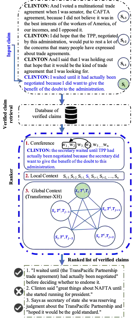 翻译:近些年来,在网上出现了虚假信息和假新闻的泛滥。减轻这些问题的传统办法是使用手工或自动核对事实。最近,出现了另一种方法:检查输入主张以前是否经过过事实检查,这可以自动进行,因而速度很快,同时也提供了可信度和解释性,这要归功于在相关事实核对文章中进行的人类事实检查和解释。这里,我们侧重于在政治辩论中提出的主张,我们研究模拟主张背景的影响:在来源方面,即在辩论中,以及在目标方面,即在事实核对解释文件中。我们这样做的方法是模拟当地环境、全球环境,以及共同参照决议的方式,以及对描述事实核对主张的文件的句子进行多动听的推理。实验结果显示,其中每一项都是宝贵的信息来源,但模拟来源方面是最重要的,并且可以比一个州式模型产生10+的绝对改进点。