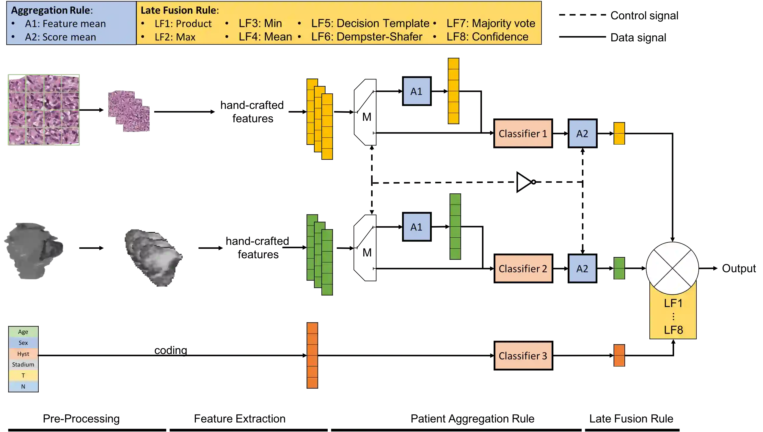 翻译:目前的癌症治疗实践收集了多式数据,如放射图象、病理学幻灯片、基因组学和临床数据等。这些数据来源的重要性个别地促进了最近放射学和病理学的上升,即从放射学和病理学图像中提取常规收集的定量特征,以预测临床结果,或用人工智能算法指导临床决定;然而,如何将这些特征纳入单一多式联运框架仍然是一个未决问题。因此,在这项工作中,我们开发了一种多式迟期混合模式,将放射学、病理学和临床数据计算出的手制特征结合起来,以预测非小细胞肺癌病人的辐射治疗结果。在此背景下,我们调查了八种不同的晚期融合规则(即产品、最低、平均值、决定模板、Dempster-Shafer、多数投票和信任规则),以及两个以耐心为基础的汇总规则,利用计算机通货法图像和整面扫描法所提供的信息的丰富性。在离心机的病人一室、病理学和临床数据交叉分析结果中进行实验,在每组内提出一个最慢的计算模型中,我们提出一个最接近的模型展示了最精确的模型。